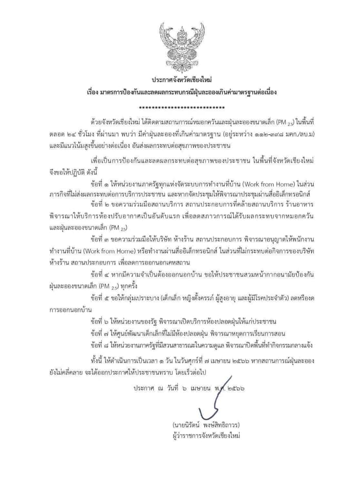 โดยวานนี้(6 เม.ย.66)นายนิรัตน์ พงษ์สิทธิถาวร ผู้ว่าราชการจังหวัดเชียงใหม่ ได้ออกประกาศจังหวัดเชียงใหม่ ให้หน่วยงานภาครัฐทุกแห่งจัดระบบการทำงานที่บ้าน Work from Home ในส่วนภารกิจที่ไม่ส่งผลกระทบต่อการบริการประชาชน เนื่องด้วยจังหวัดเชียงใหม่ มีสถานการณ์หมอกควันและฝุ่นละอองขนาดเล็ก (PM 2.5) ในพื้นที่ตลอด 24 ชั่วโมง ที่ผ่านมามีค่าเกินค่ามาตรฐาน (อยู่ระหว่าง 112-398 มคก/ลบ.ม) และมีแนวโน้มสูงขึ้นอย่างต่อเนื่อง อาจส่งผลกระทบต่อสุขภาพของประชาชน จึงได้ออกประกาศฉบับดังกล่าว เพื่อเป็นการป้องกันและลดผลกระทบต่อสุขภาพของประชาชน ในพื้นที่จังหวัดเชียงใหม่