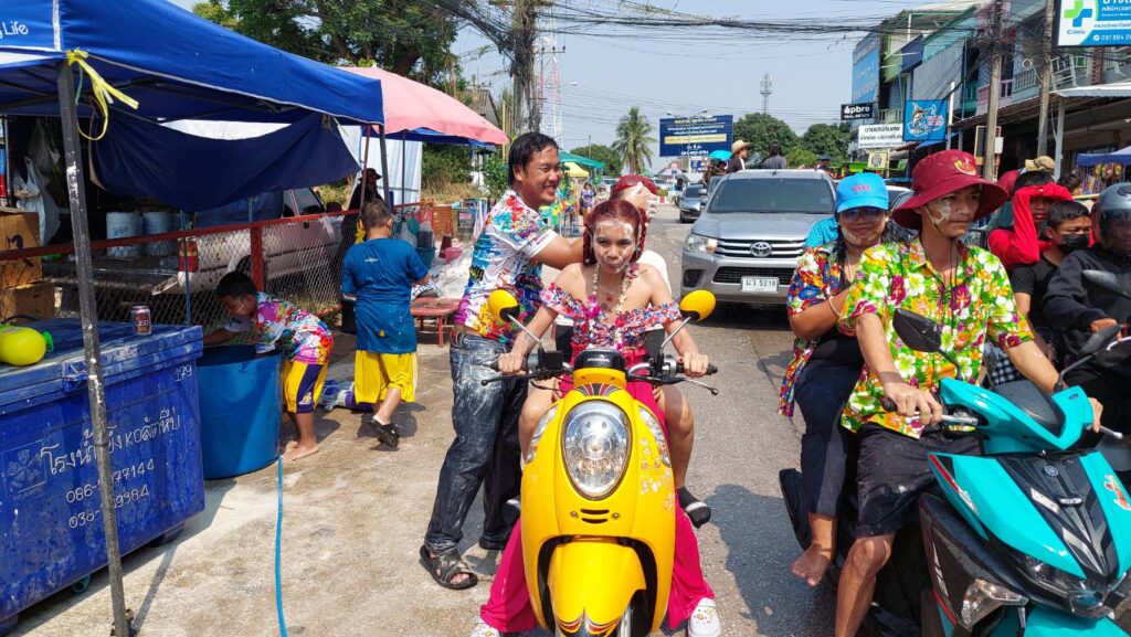 บรรยากาศการเล่นสงกรานต์ ในอำเภอสัตหีบ จังหวัดชลบุรี โดยวันนี้เป็นวันไหลของพื้นที่ตำบลบางเสร่ ตำบลสัตหีบ อำเภอสัตหีบ จังหวัดชลบุรี ประชาชนได้ร่วมกันสรงน้ำพระและผู้สูงอายุตามประเพณี โดยถนนภายนอกวัดได้มีนักท่องเเที่ยว วัยรุ่น และประชาชนขับขี่รถจักรยานยนต์และนำถังน้ำขึ้นหลังรถกระบะ มาร่วมกันเล่นสงกรานต์กันเต็มท้องถนน นับพันคนทำให้ภายในบางเสร่ รถติดกันความยาว
