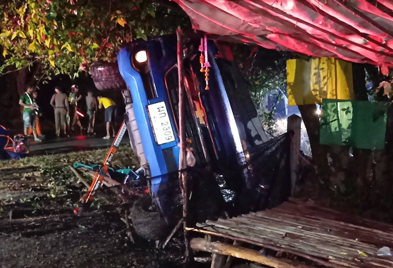 ฝนตกหนักถนนลื่น รถกระบะเสียหลักพุ่งชนเสาไฟฟ้าโคราช บาดเจ็บ 2 ราย