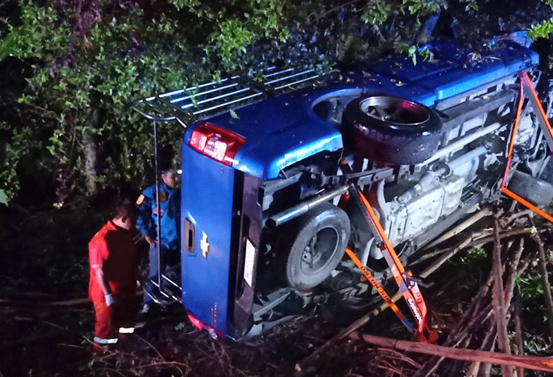 ฝนตกหนักถนนลื่นกระบะชนเสาไฟเจ็บ2