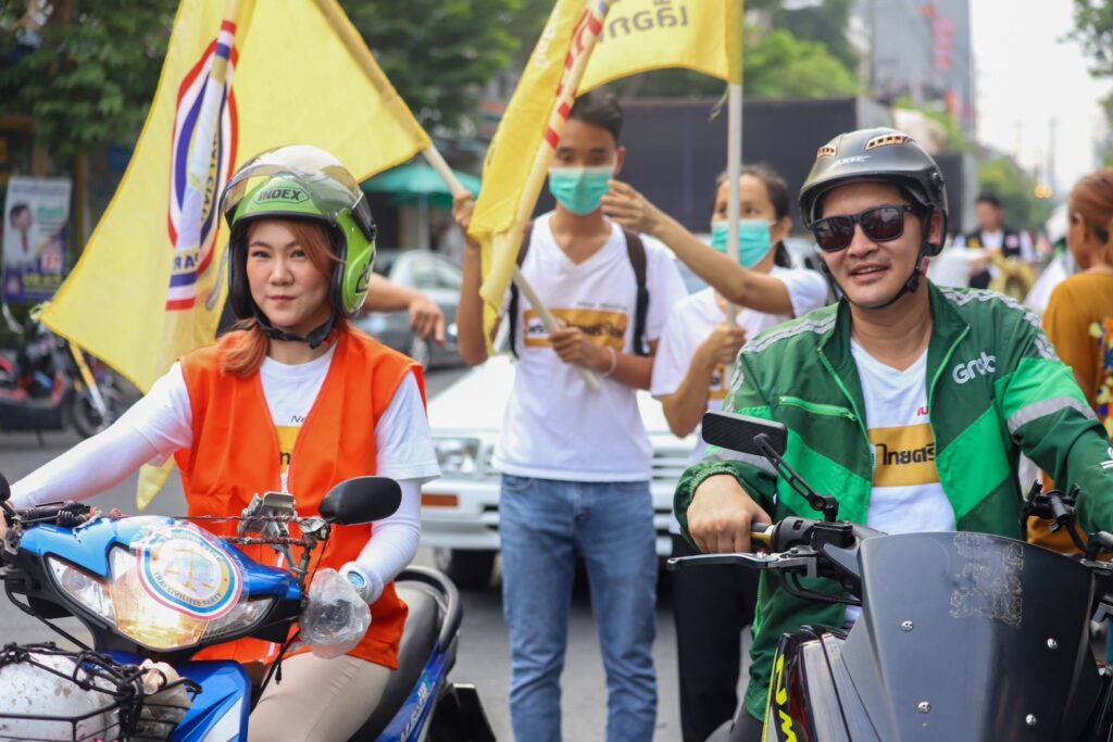 โดยนายมงคลกิตติ์ กล่าวว่า การที่ตนและนางสาวพัทธนันท์ ขี่มอเตอร์ไซด์มาลงพื้นที่หาเสียงที่ตลาดราชวัตรพร้อมๆ กัน แต่แตกต่างกันที่ตนสวมบทบาทเป็นเป็นไรเดอร์ผู้ส่งความอร่อยจากร้านอาหารที่อร่อยและมีมากมายในย่านตลาดราชวัตร ส่งไปยังพื้นที่ต่างๆ ส่วนนางสาวพัทธนันท์ สวมบทบาท เป็นพี่วินมอเตอร์ไซด์ที่ขนส่งคนไปในที่ต่างๆซึ่งแสดงให้เห็นถึงความตั้งใจของพรรคไทยศรีวิไลย์ มีนโยบายที่รองรับและสามารถช่วยกลุ่มคนเหล่านี้ได้ ซึ่งไม่ว่าจะเป็นแกร็บ วินรถจักยานยนต์ หรือรถตุ๊กตุ๊ก ส่วนใหญ่จะไม่ได้รับสิทธิประโยชน์จากรัฐเท่าที่ควร