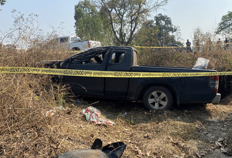 ตรวจสอบที่เกิดเหตุ พบรถกระบะสีดำสภาพรถยนต์ด้านหน้าได้รับความเสียหาย ไม่พบผู้บาดเจ็บ หรือผู้ใดแสดงตัวเป็นผู้ครอบครองรถยนต์คันดังกล่าว เจ้าหน้าที่ได้ตรวจภายในรถยนต์ เบื้องต้นพบห่อวัตถุต้องสงสัยคล้ายยาเสพติดให้โทษอยู่ภายในรถปิคอัพจึงรายงานผู้บังคับบัญชาตามลำดับชั้นให้ทราบ และได้ประสานการปฏิบัติกับกองพิสูจน์หลักฐาน ภ.จังหวัดฯ เพื่อไปตรวจสอบภายใยรถยนต์คันดังกล่าว
