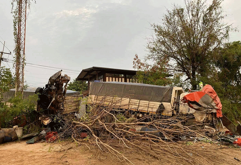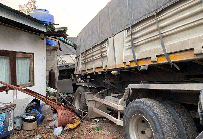 หวิดตายหมู่!รถบรรทุกพ่วงหลับในพุ่งชนบ้านพังยับ