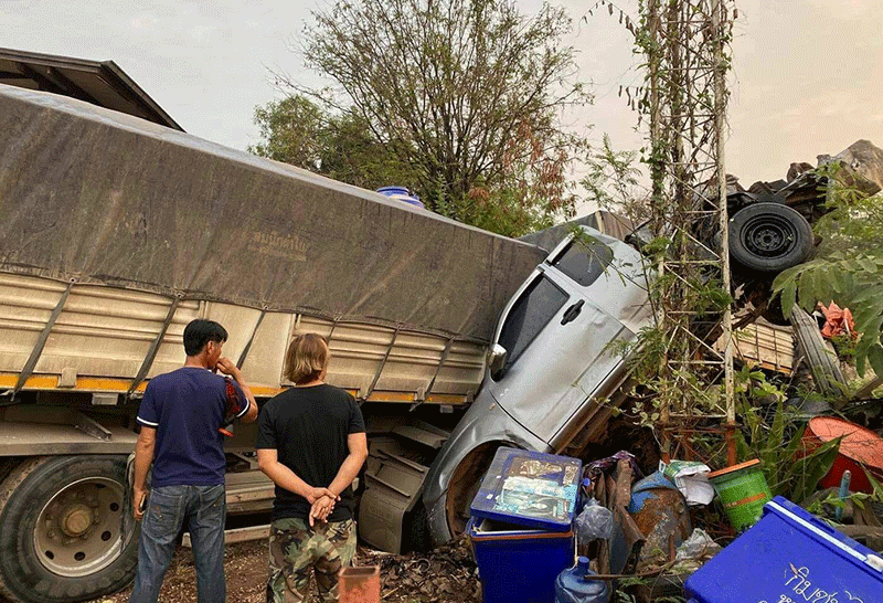 หวิดตายหมู่! รถบรรทุกพ่วงหลับใน ชนศาลาพักริมทาง ก่อนพุ่งชนรั้วบ้านอัดรถกระบะและจยย.พังยับ 3 คัน ไร้คนเจ็บ