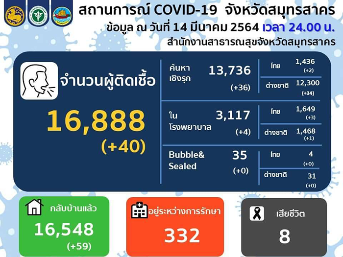 สมุทรสาครติดโควิด-19 เพิ่มอีก 40 ราย สะสม 16,888 ราย เสียชีวิตคงที่ 8 ราย