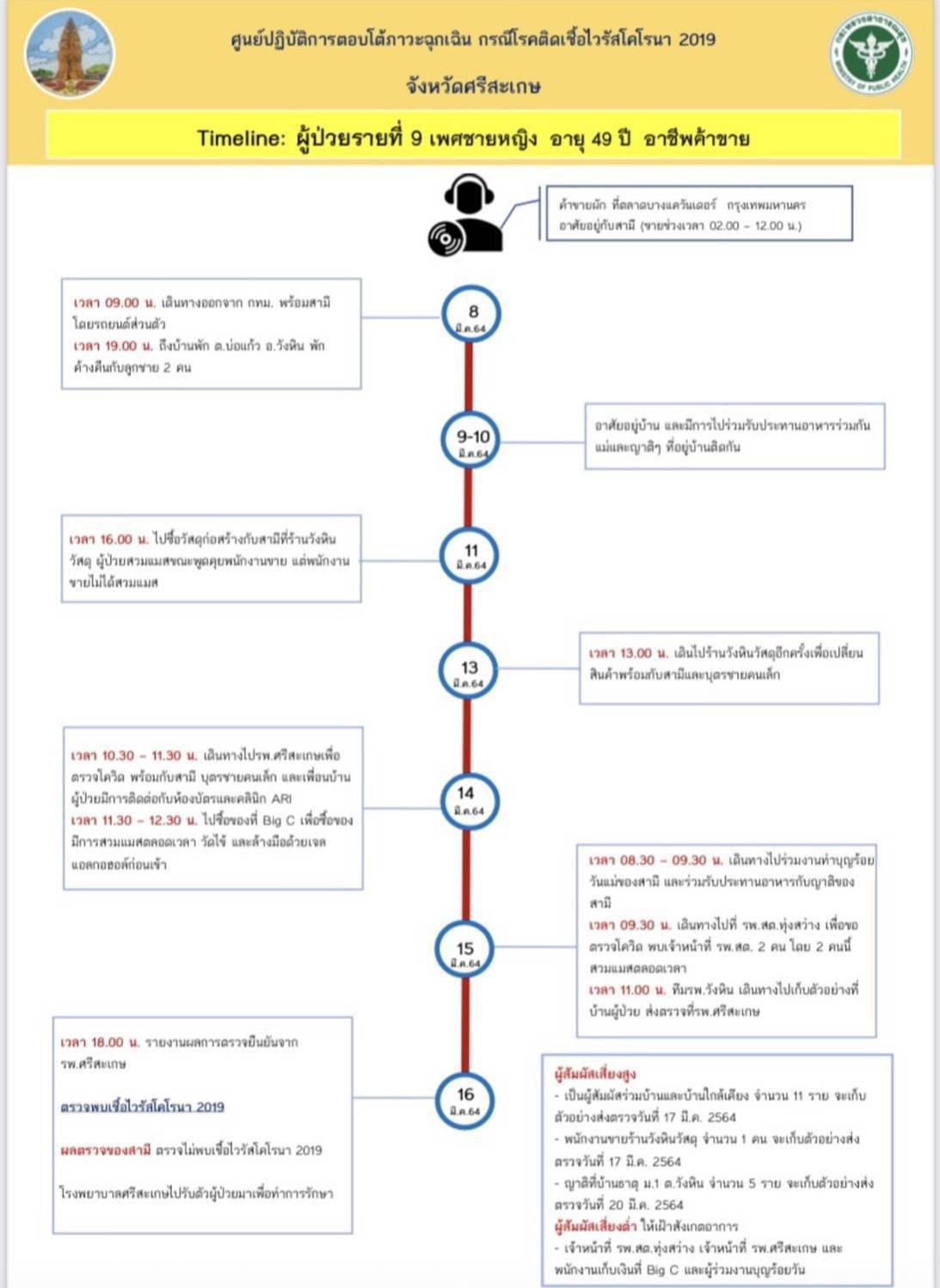 ศูนย์ปฏิบัติการตอบโต้ภาวะฉุกเฉิน กรณีโรคติดเชื้อไวรัสโคโรนา 2019 จ.ศรีสะเกษ เปิดเผย Timeline ผู้ป่วยรายที่ 9 นับรวมกับโควิดรอบแรก และเป็นรายแรกของการติดเชื้อรอบ 2 เป็นเพศหญิง อายุ 49 ปี อาชีพค้าขายผัก ที่ตลาดบางแควันเดอร์ กรุงเทพฯ อาศัยอยู่กับสามี (ขายช่วงเวลา 02.00 – 12.00 น.) เมื่อวันที่ 8 มี.ค.64 เวลา 09.00 น. เดินทางออกจากกรุงเทพฯ พร้อมสามี โดยรถยนต์ส่วนตัว เวลา 19.00 น. ถึงบ้านพัก ต.บ่อแก้ว อ.วังหิน พักค้างคืนกับลูกชาย 2 คน ในวันที่ 9 – 10 มี.ค. 64 อาศัยอยู่บ้าน และมีการไปร่วมรับประทานอาหารร่วมกันกับแม่ และญาติๆ ที่อยู่บ้านติดกัน