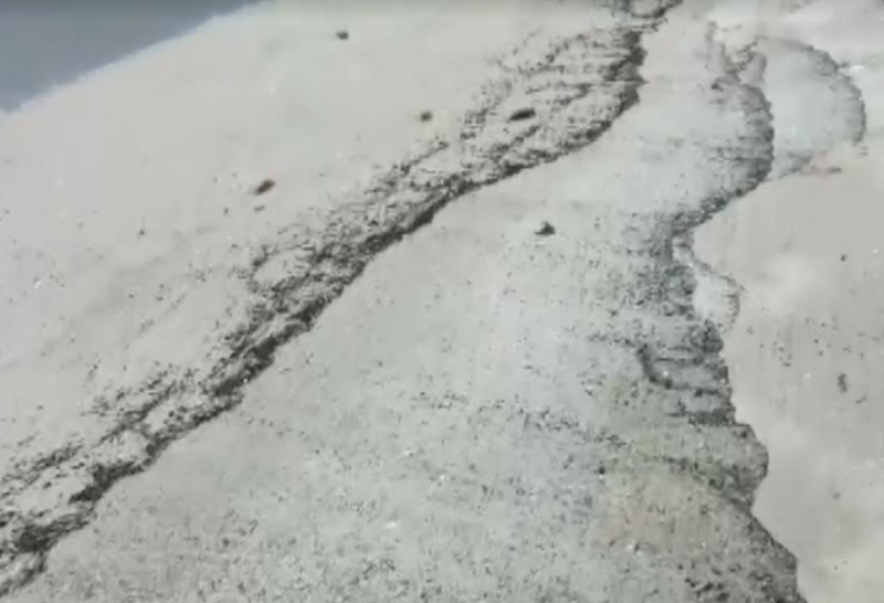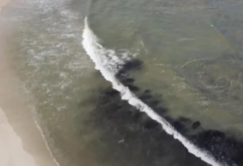 ภาพมุมสูงที่ชายหาดในอำเภอหัวไทร จังหวัดนครศรีธรรมราช สภาพก้อนน้ำมันปริศนา ยังคงถูกคลื่นลมพัดพาเข้าฝั่งอย่างต่อเนื่อง ก้อนน้ำมันจำนวนไม่น้อยไปติดอยู่ที่กองหินแนวกันคลื่นจนมีสีดำคล้ำอย่างเห็นได้ ส่วนที่หลุดรอดเข้ามาถึงฝั่งได้ ยังคงถูกซัดเข้ามาอย่างต่อเนื่องโดยเฉพาะช่วงที่มีน้ำขึ้นสูง ส่วนที่เกยหาดแล้วจะถูกแดดเผาจนละลายกลายเป็นของเหลวสีดำคล้ำซึมลงไปบนหาดทราย และยังส่งผลให้ทรายจับตัวเป็นก้อนดำ โดยปรากฏการณ์นี้เกิดขึ้นในพื้นที่ชายฝั่งของอำเภอหัวไทรมากกว่า 1 สัปดาห์แล้วและพบว่ายังเกิดขึ้นยาวตลอดชายหาดไปจนถึงเขตอำเภอระโนด สทิงพระ และสิงหนคร ของจังหวัดสงขลาอีกด้วย