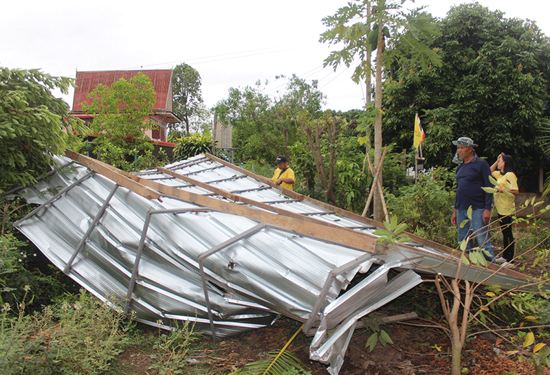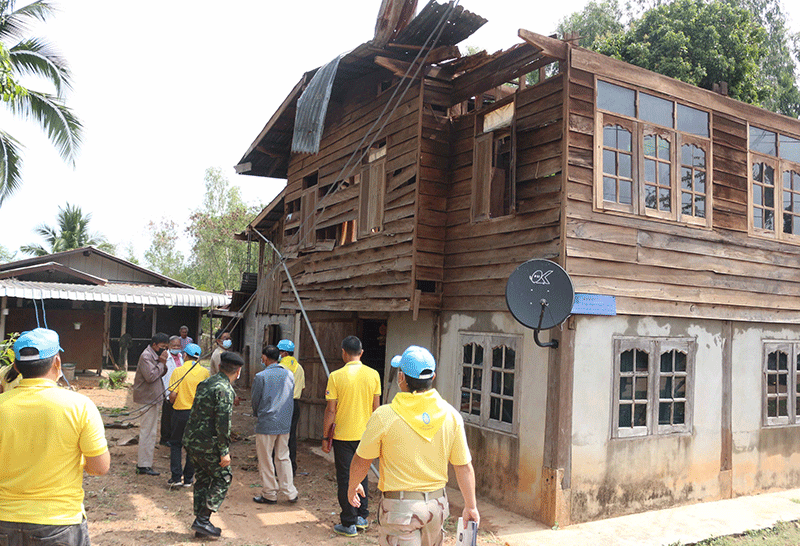 โดยเฉพาะบ้านของนายบุญเดิม ห่ามกระโทก อายุ 51 ปี หลังคาบ้านชั้น 2 ถูกลมพัดปลิวหายไปเกือบหมดซึ่งนายบุญเดิม ฯ บอกว่า เหตุการณ์ในครั้งนี้ถือเป็นเหตุการณ์พายุที่รุนแรงที่สุดเท่าที่ตนเคยประสบมา วันนี้จึงต้องเร่งซ่อมแซมหลังคาบ้านโดยด่วน เนื่องจากสภาพอากาศครึ้มฝนตลอดทั้งวัน จึงเกรงว่าจะเกิดฝนตกลงมา และจะทำให้คนในบ้านลำบากไม่มีที่หลบฝน ซึ่งหลังจากนี้ เจ้าหน้าที่ฯ จะออกทำการสำรวจความเสียหายอย่างละเอียด เพื่อเร่งดำเนินการให้ความช่วยเหลือตามระเบียบของทางราชการโดยเร็ว