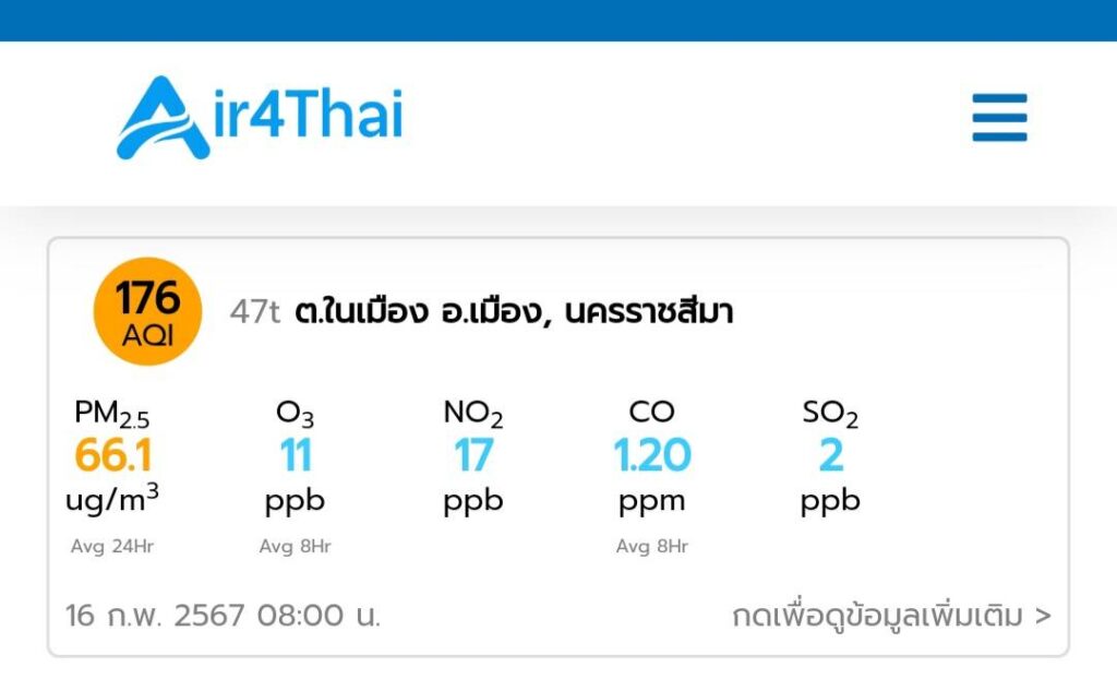 พร้อมกับประสานองค์กรปกครองส่วนท้องถิ่น ช่วยอีกทางหนึ่งด้วย ซึ่งวันนี้ คุณภาพอากาศของจังหวัดนครราชสีมา ค่าฝุ่นมลพิษในอากาศอยู่ในเกณฑ์สีส้ม เริ่มมีผลกระทบต่อสุขภาพ ควรเฝ้าระวังสุขภาพ และควรลดระยะเวลาทำกิจกรรมกลางแจ้ง โดยการตรวจวัดผ่านแอพพลิเคชั่น Air4Thai พบว่า ค่าฝุ่น PM 2.5 อยู่ที่ 66.1 ไมโครกรัมต่อลูกบาศก์เมตร ซึ่งเกินกว่าค่ามาตรฐาน ในขณะที่ดัชนีคุณภาพอากาศ ซึ่งเป็นข้อมูลรายงานคุณภาพอากาศในภาพรวมที่ประกอบด้วยมลพิษทางอากาศ 6 ชนิด พบว่า เมื่อเวลา 08.00 น.วันนี้ ดัชนีคุณภาพอากาศ พุ่งสูงถึง 176 AQI