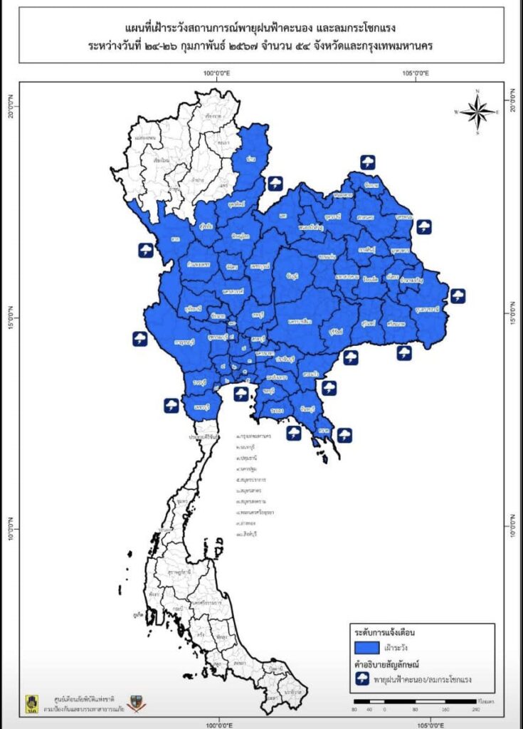ปภ.เน้นย้ำ 54 จังหวัด เหนือ-อีสาน-กลาง และ กทม. เฝ้าระวังพายุฝนฟ้าคะนองและลมกระโชกแรง ช่วงวันที่ 24 – 26 ก.พ. 67