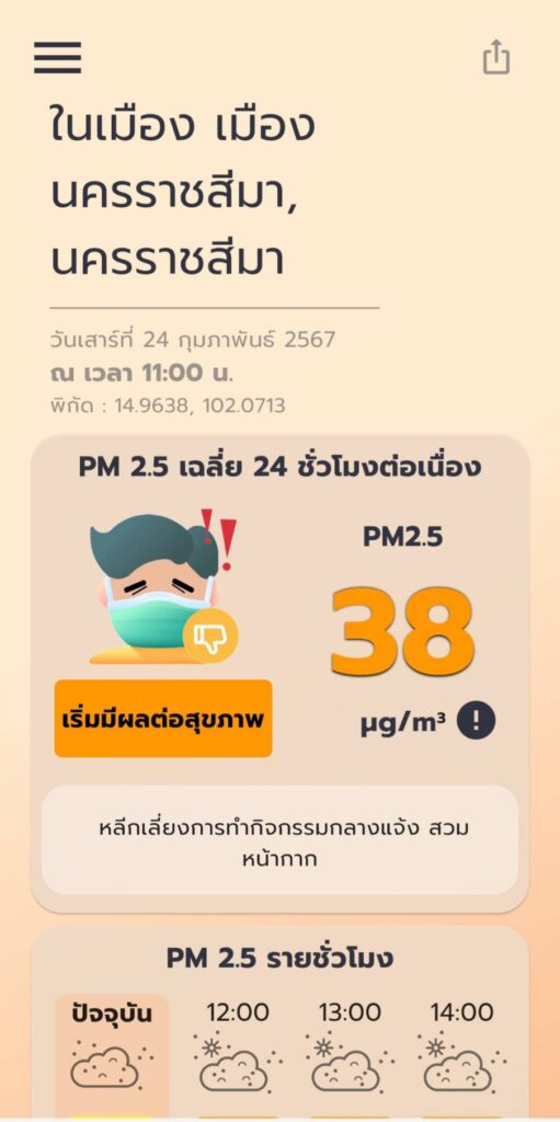 ในขณะที่ศูนย์บัญชาการเหตุการณ์จังหวัดนครราชสีมา ได้ซักซ้อมมาตรการและแนวทางปฏิบัติการป้องกันและแก้ไขปัญหาไฟป่า หมอกควัน และฝุ่นละอองขนาดเล็ก (PM 2.5) โดยเฉพาะปัญหาฝุ่นละอองจากการเผาในที่โล่ง ซึ่งปัจจุบันมีการรายงานสถานการณ์ฝุ่นละอองขนาดเล็กและติดตามผลการดำเนินงานในระดับพื้นที่ทุกวัน ผ่านกลุ่มไลน์ “PM 2.5 โคราช” ซึ่งวันนี้ สำนักงานสิ่งแวดล้อมและควบคุมมลพิษที่ 11 นครราชสีมา รายงานสถานการณ์คุณภาพอากาศ จ.นครราชสีมา ว่า เขต ต.ในเมือง อ.เมืองนครราชสีมา เมื่อเวลา 11.00 น. ที่ผ่านมา ตรวจวัดคุณภาพอากาศผ่านแอพพลิเคชั่น Air4Thai วัดค่าฝุ่น PM2.5 ได้ 37 ไมโครกรัมต่อลูกบาศก์เมตร ส่วนดัชนีคุณภาพอากาศ ตรวจวัดได้ 98 AQI คุณภาพอากาศอยู่ในระดับปานกลาง สามารถทำกิจกรรมกลางแจ้งได้ตามปกติ