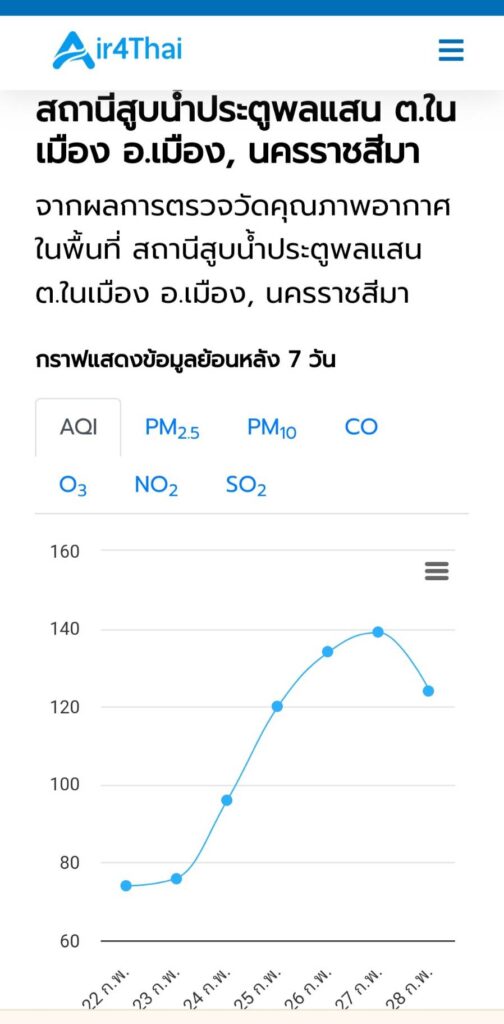 วันนี้ (28 กุมภาพันธ์ 2567) สำนักงานสิ่งแวดล้อมและควบคุมมลพิษที่ 11 นครราชสีมา ได้รายงานสถานการณ์ฝุ่นมลพิษวันนี้ในพื้นที่ จ.นครราชสีมา จากการตรวจวัดคุณภาพอากาศผ่านแอพพลิเคชัน Air4Thai ในช่วง 7 วัน ตั้งแต่วันที่ 22-28 กุมภาพันธ์ 2567