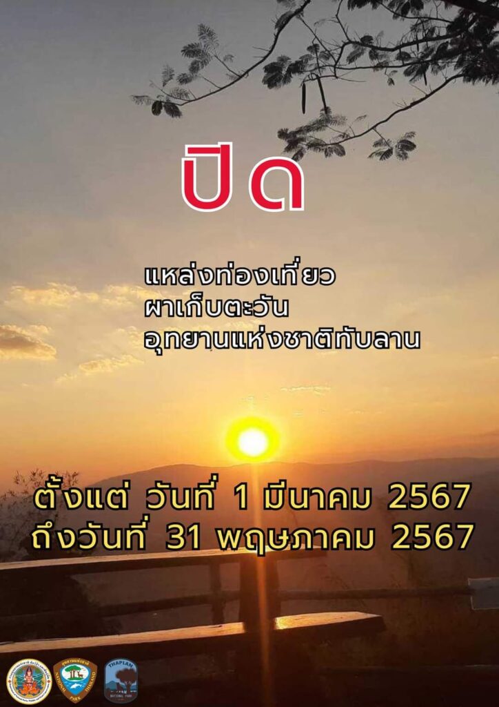 อุทยานแห่งชาติทับลาน จึงขอปิดแหล่งท่องเที่ยวผาเก็บตะวัน ตั้งแต่วันที่ 1 มีนาคม 2567 ถึง 31 พฤษภาคม 2567 เพื่อปรับปรุงทัศนียภาพและเป็นการฟื้นฟูธรรมชาติไปในตัว พร้อมกันนี้ ยังได้โพสต์หนังสือประกาศของอุทยานแห่งชาติทับลาน เรื่อง ปิดการท่องเที่ยวและพักแรมในอุทยานแห่งชาติทับลาน ประจำปี พ.ศ.2567 ตามประกาศกรมอุทยานแห่งชาติ สัตว์ป่า และพันธุ์พืช ฉบับลงวันที่ 18 ธันวาคม พ.ศ.2566 เรื่อง ปิดการท่องเที่ยวและพักแรมในอุทยานแห่งชาติและวนอุทยาน ประจำปี พ.ศ. 2567 เพื่อให้การบริหารจัดการแหล่งท่องเที่ยว เป็นไปอย่างมีประสิทธิภาพ สอดคล้องกับสภาพอากาศในแต่ละฤดูกาล และความสามารถในการรองรับของทรัพยากร เปิดโอกาสให้ทรัพยากรธรรมชาติได้ฟื้นตัว