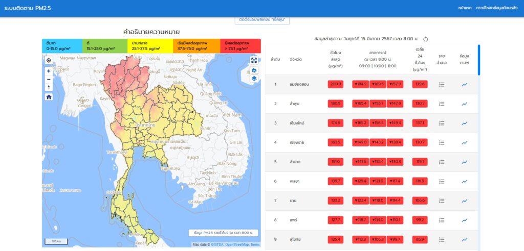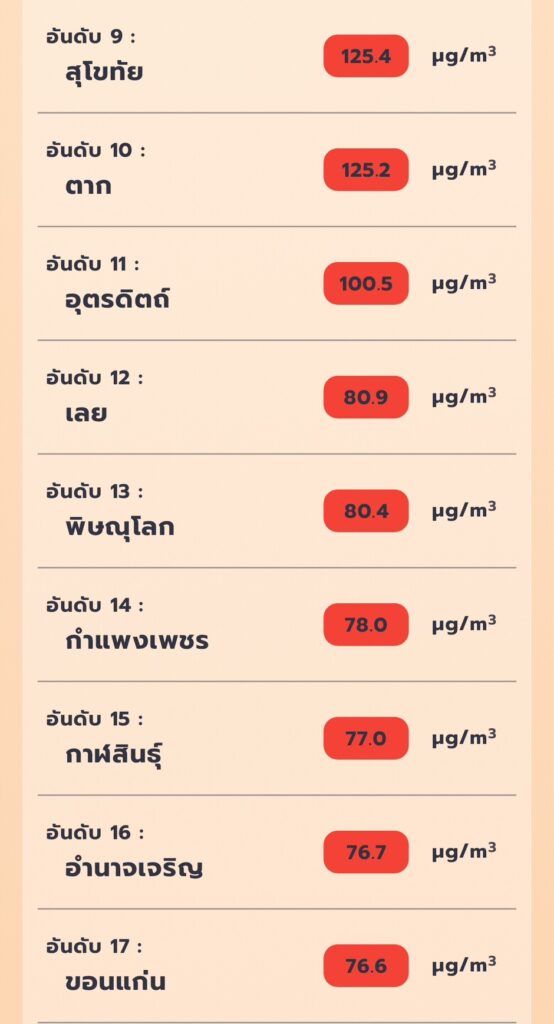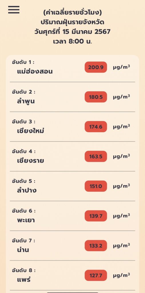 เมื่อเวลา 08.00 น. ของวันที่ 15 มีนาคม 2567 พบ 17 จังหวัดภาคเหนือ มีค่าฝุ่นเกินเกณฑ์มาตรฐานในระดับสีแดง มีผลกระทบต่อสุขภาพและระบบทางเดินหายใจ อาทิ #แม่ฮ่องสอน 200.9 ไมโครกรัม #ลำพูน 180.5 ไมโครกรัม #เชียงใหม่ 174.6 ไมโครกรัม #เชียงราย 163.5 ไมโครกรัม #ลำปาง 151 ไมโครกรัม #พะเยา 139.7 ไมโครกรัม #น่าน 133.2 ไมโครกรัม #แพร่ 127.7 ไมโครกรัม #สุโขทัย 125.4 ไมโครกรัม #ตาก 125.2 ไมโครกรัม #อุตรดิตถ์ 100.5 ไมโครกรัม #เลย 80.9 ไมโครกรัม #พิษณุโลก 80.4 ไมโครกรัม #กำแพงเพชร 78 ไมโครกรัม #กาฬสินธุ์ 77 ไมโครกรัม #อำนาจเจริญ 76.7 ไมโครกรัม #ขอนแก่น 76.6 ไมโครกรัม