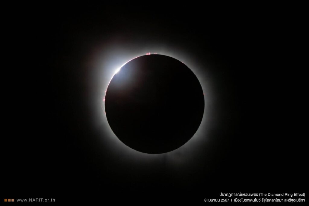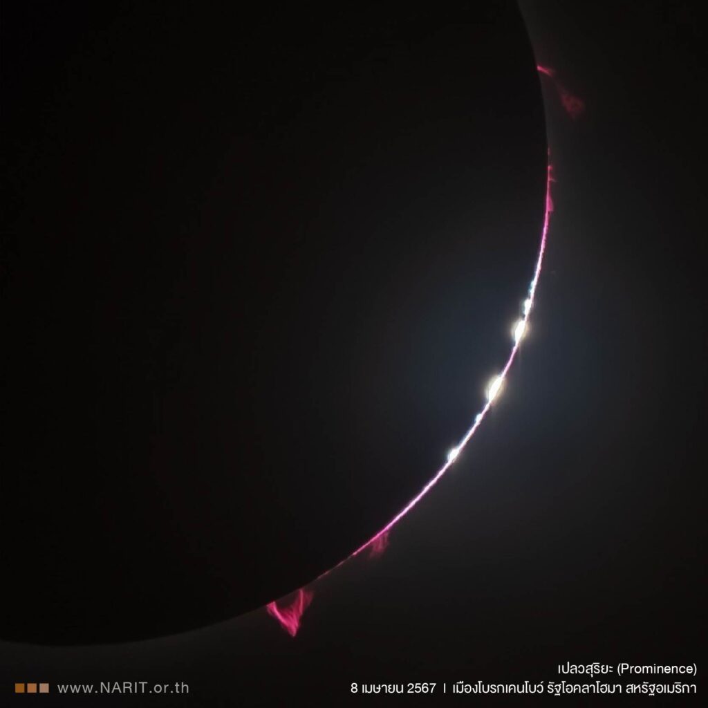 ผู้สื่อข่าว จ.ปราจีนบุรี รายงานว่า ได้รับแจ้งจากจากงานประชาสัมพันธ์และสื่อสารองค์กรสถาบันวิจัยดาราศาสตร์แห่งชาติ (องค์การมหาชน) (สดร.) กระทรวงการอุดมศึกษา วิทยาศาสตร์ วิจัย และนวัตกรรม (อว.) เผยภาพ “สุริยุปราคาเต็มดวง” วันที่ 8 เมษายน 2567 ณ เมืองโบรกเคนโบว์ รัฐโอคลาโฮมา สหรัฐอเมริกา แม้ขณะเกิดสุริยุปราคาเต็มดวงในครั้งนี้สภาพท้องฟ้ามีเมฆบางๆ ตลอดปรากฏการณ์ แต่ก็สามารถสังเกตเห็นปรากฏการณ์ลูกปัดของเบลีย์ ปรากฏการณ์แหวนเพชร ชั้นโคโรนา และเปลวสุริยะได้อย่างชัดเจน