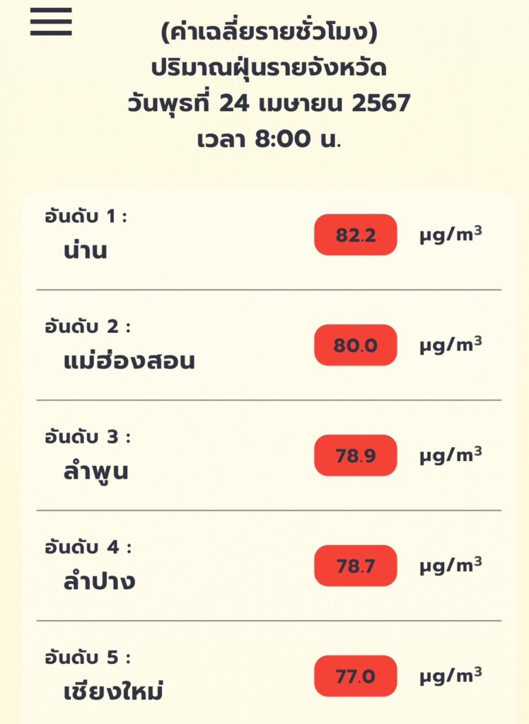 เมื่อเวลา 08.00 น. ของวันที่ 24 เมษายน 2567 พบ 5 จังหวัด มีค่าฝุ่นเกินเกณฑ์มาตรฐานในระดับสีแดงที่มีผลกระทบต่อสุขภาพและระบบทางเดินหายใจ ได้แก่ #น่าน 82.2 ไมโครกรัม #แม่ฮ่องสอน 80 ไมโครกรัม #ลำพูน 78.9 ไมโครกรัม #ลำปาง 78.7 ไมโครกรัม และ #เชียงใหม่ 77 ไมโครกรัม ส่วนอีก 23 จังหวัดโซนภาคเนือ และภาคตะวันออกเฉียงเหนือ มีค่าคุณภาพอากาศเกินมาตรฐานในระดับสีส้ม