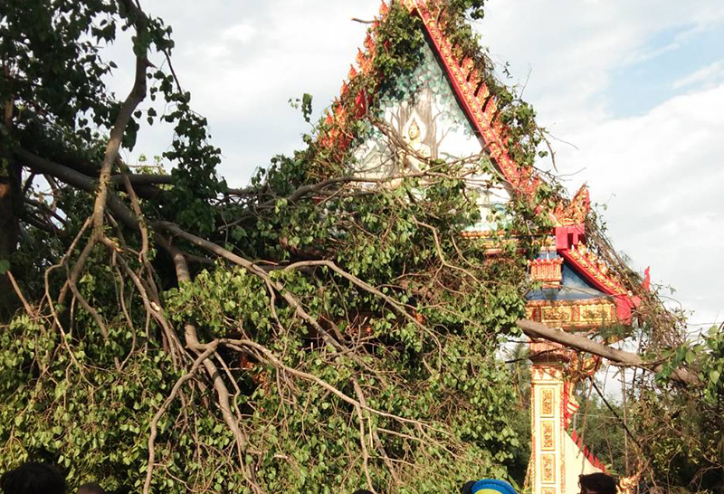 และที่บ้านสวนหอม หมู่ที่ 4 ต.ตูม อ.ปักธงชัย ซึ่งเป็นจุดที่ชาวบ้านแจ้งเหตุ พบว่า กิ่งก้านขนาดใหญ่ของต้นโพธิ์ที่ขึ้นเองตามธรรมชาติ ที่บริเวณข้างศาลาที่พักสายตรวจตำบลตูม สภ.ปักธงชัย ได้หักโค่นลงมาใส่รถจักรยานยนต์ของชาวบ้านนับสิบคัน ขณะเดียวกันก็มีต้นไม้ใหญ่หักโค่นขวางทางเข้าประตูวัดด้วย