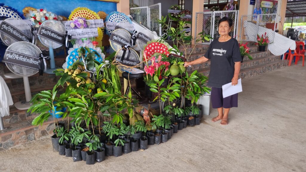 ที่มาของซุ้มผลไม้และพืชผลทางการเกษตรเหล่านี้จากการสอบถาม นางบุญสม วงศ์ชนะ อายุ 79 ปี ซึ่งเป็นภรรยาของลุงชุ บอกว่า ผลไม้เหล่านี้มาจากสวนที่ลุงชุ สามี ปลูกเองกับมือ และบางส่วนเช่นสะตอพันธุ์ตรัง1 ลูกชายซึ่งเป็นผอ.ศูนย์วิจัยพืชสวนยะลานำมาให้เพราะสามีชอบทำสวน