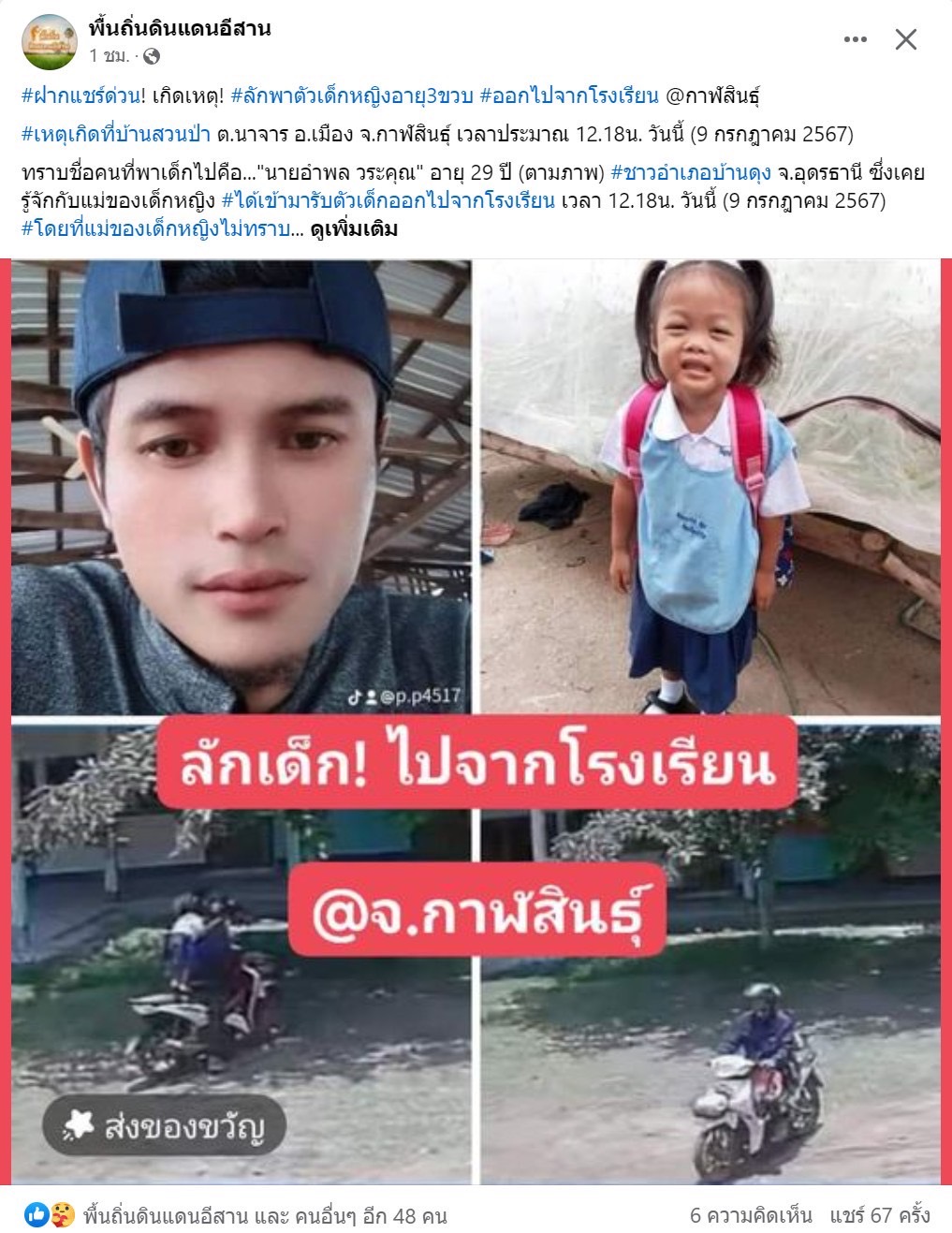 จากกรณีที่มี ผู้ใช้เฟสบุ๊ค โพสต์ภาพและข้อความ ฝากตามหาเด็กถูกลักพาตัวจากโรงเรียน หลังไปตรวจสอบพบว่า คนที่พาเด็กไปคือ นายอำพล วระคุณ อายุ 29 ปี ชาว อ.บ้านดุง จ.อุดรธานี ก่อเหตุลักพาตัว น้องอุ๋งอิ๋ง อายุ 3 ขวบ จากโรงเรียนองค์การอุตสาหกรรมป่าไม้ 7 บ้านสวนป่า ต.นาจารย์ อ.เมือง จ.กาฬสินธุ์ โดยชายดังกล่าวเป็นคนที่เคยคบหากับแม่ของน้องอุ๋งอิ๋ง และแม่ของน้องได้ขอเลิกคบไปแล้ว