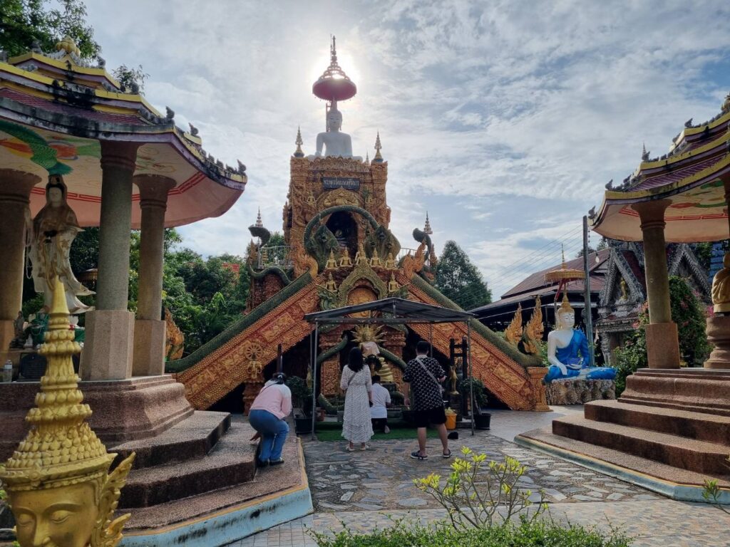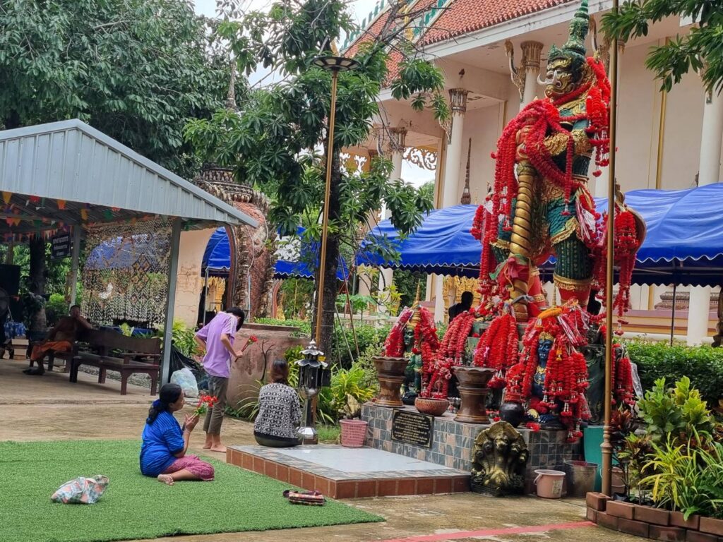ที่ด้านข้างพระอุโบสถ อันเป็นที่ตั้งของปู่ท้าวเวชสุวรรณ พบนักท่องเที่ยว นอกจากเดินทางมาพักผ่อนชมประมามากรรมจากเปลือกหอยแล้ว ก่อนถึงวันหวยออก เมื่อเดินทางมาแล้ว อาจได้โชคลาภกลับไปเปลี่ยนแปลงฐานะ ล้างหนี้ แก้จน ได้พากันนำดอกไม้แดง , ธูป เทียน มาไหว้สักการะขอพร ขอโชคลาภ อธิษฐานขอเลขเด็ด! งวดที่จะออก ลุ้นกันในวันที่ 16 ก.ค.67 นี้ จำนวนมาก