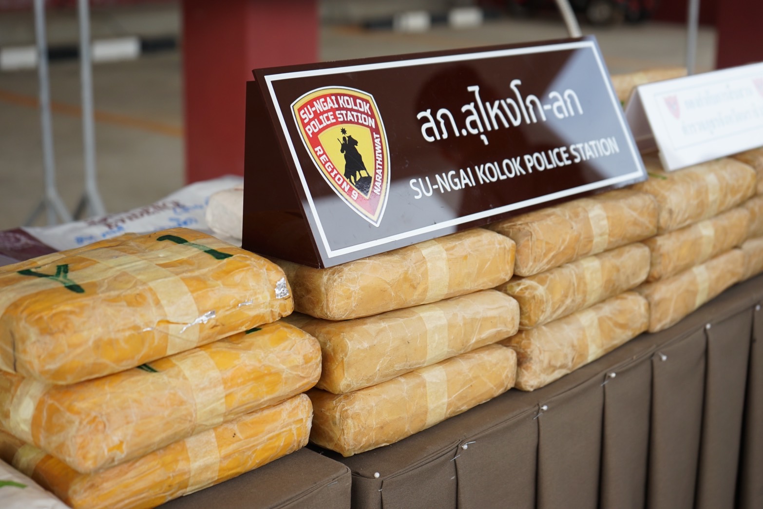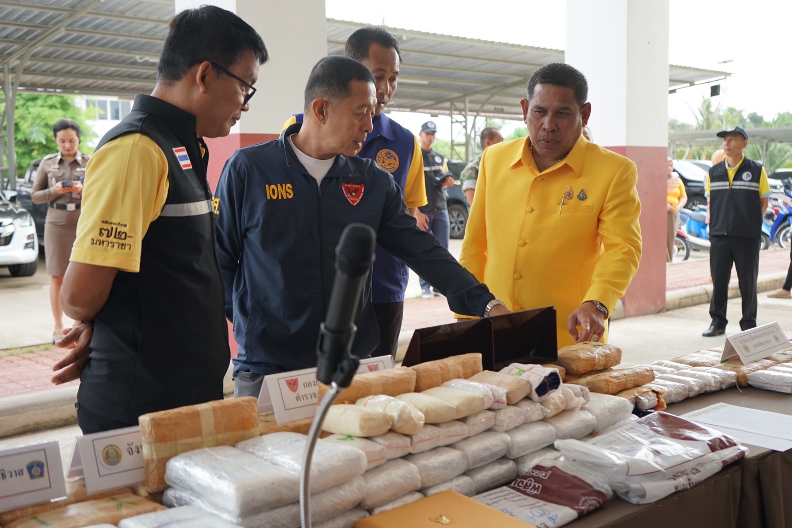 พล.ต.ต.กฤษฎา แก้วจันดี รอง ผบช.ภ.9/รอง ผบ.ศปก.ตร. สน., พล.ต.ต.ไมตรี สันตยากุล ผบก.ภ.จว.นราธิวาส,นายสังคม เกิดก่อ ปลัดจังหวัดนราธิวาส,พ.ต.อ.เจษฎาวิทย์ อินทร์ประพันธ์ ผกก.สภ.สุไหงโก-ลก, พ.ต.อ.นิยม สุวรรณคง ผกก.สส.ภ.จว.นราธิวาส แถลงข่าวจับกุมผู้ต้องหาพร้อมยาเสพติดให้โทษประเภท 1 (ยาบ้า) รวมทั้งเฮโรอีน กลางเมืองสุไหงโก-ลก จ.นราธิวาส เมื่อวันที่ 4 กรกฎาคม 2567 ที่ผ่านมา