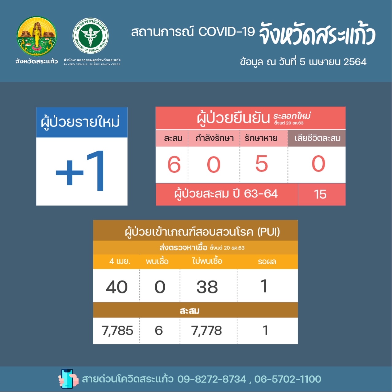 จังหวัดสระแก้วมีรายงานผู้ป่วยยืนยันโควิด-19 เพิ่มขึ้นอีก 1 ราย นับเป็นรายที่ 6 จากการระบาดระลอกใหม่ของจังหวัดสระแก้ว เป็นชาย อายุ 41 ปี อาชีพค้าขาย อาศัยอยู่ในพื้นที่ ต.สระแก้ว อ.เมืองสระแก้ว จังหวัดสระแก้ว เป็นกลุ่มที่ติดเชื้อมีความเชื่อมโยงกับสถานบันเทิงใน กทม. โดยผู้ป่วยมีประวัติเดินทางไปเที่ยวที่คริสตัลคลับ ทองหล่อ เมื่อวันที่ 27 มีนาคมที่ผ่านมา กับเพื่อน 3 คน หลังจากเลิกจากผับไปกินข้าวต้มที่เขตรามอินทราก่อนจะกลับบ้านพัก จากนั้นเดินทางกลับจังหวัดสระแก้วตอนเที่ยงของ วันที่ 28 มีนาคม 64