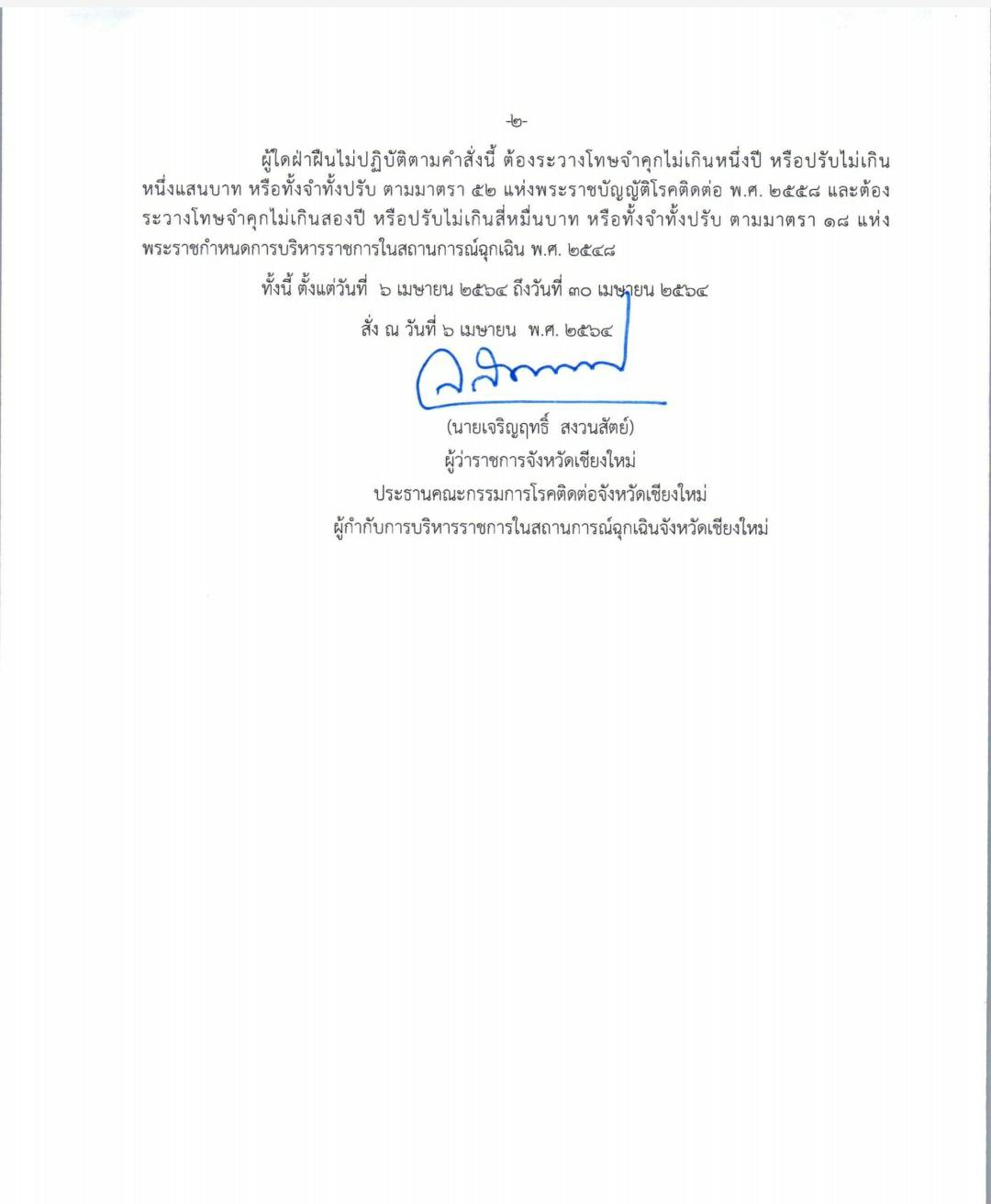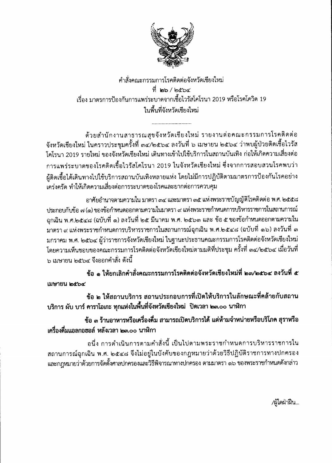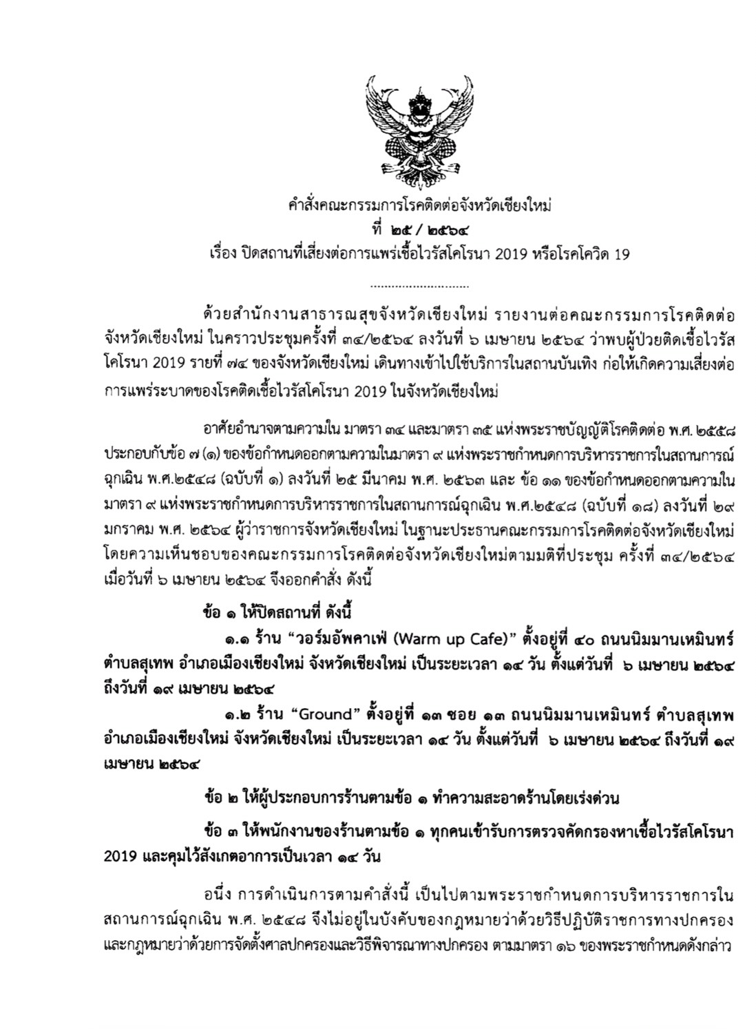 “นอกจากนี้ คณะกรรมการโรคติดต่อจังหวัดเชียงใหม่ ยังมีมติให้ปิดร้าน วอร์อัพคาร์เฟ่ และร้าน กราวน์ เป็นเวลา 14 วัน โดยให้มีผลตั้งแต่วันที่ 6 – 19 เม.ย. 64 เพราะเป็นร้านที่ปรากฏในไทม์ไลน์ที่ผู้ป่วยให้ข้อมูลไว้ว่าได้เข้าไปใช้บริการ โดยจะมีการทำความสะอาดร้านดังกล่าว และทางเจ้าหน้าที่จะได้ทำการตรวจคัดกรองพนักงานของร้านทั้ง 2 แห่ง ทุกคน รวมถึงให้พนักงานทุกคนกักตัวเพื่อเฝ้าดูอาการเป็นเวลา 14 วันด้วย ซึ่งเป็นการปฏิบัติตามมาตรการการควบคุมโรคโควิด-19” รอง ผวจ.เชียงใหม่ แจง