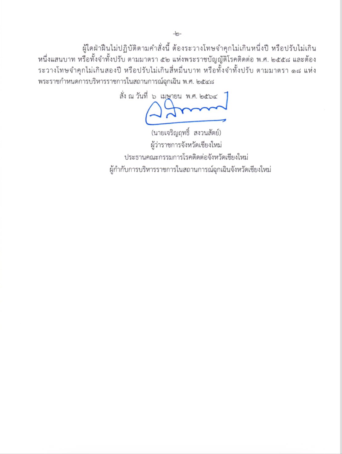 นายวีระพันธ์ ดีอ่อน รองผู้ว่าราชการจังหวัดเชียงใหม่ และ นพ.จตุชัย มณีรัตน์ นายแพทย์สาธารณสุขจังหวัดเชียงใหม่ แถลงข่าวผ่านสื่อมวลชนถึงสถานการณ์โรคโควิด -19 ในพื้นที่จังหวัดเชียงใหม่ ประจำวันที่ 6 เม.ย. 64 นายวีระพันธ์ ดีอ่อน รองผู้ว่าราชการจังหวัดเชียงใหม่ กล่าวว่า วันนี้จังหวัดเชียงใหม่ตรวจพบผู้ติดเชื้อไวรัสโคโรนา หรือ โควิด-19 เพิ่มอีก 2 ราย รวมมีผู้ป่วยสะสมที่รักษาตัวอยู่ในโรงพยาบาลรวม 6 ราย วันนี้คณะกรรมการโรคติดต่อฯ ก็มีมติยกระดับในการควบคุมโรคขึ้นอีก มีการปรับปรุงคำสั่งที่ 23/2564 โดยให้สถานบริการ สถานประกอบการคล้ายสถานบริการ ผับ บาร์ คาราโอเกะ ปิดบริการตั้งแต่เวลา 23.00 น. เป็นต้นไป ส่วนร้านอาหารและเครื่องดื่มเปิดให้ลูกค้าดื่มเครื่องดื่มแอลกอฮอล์ในร้านได้แค่เวลา 23.00 น.