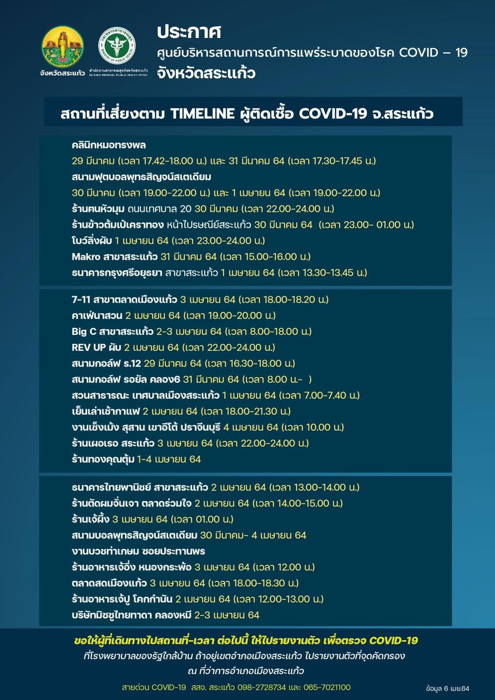 สำหรับผู้ที่เดินทางไปในสถานที่และวันเวลาดังกล่าว หรือไม่แน่ใจว่าตนเองเสี่ยงต่อการรับเชื้อหรือไม่ ให้เดินทางไปรับการตรวจหาเชื้อโควิด-19 ทันทีได้ที่โรงพยาบาลของรัฐทุกแห่งในจังหวัดสระแก้ว โดยขอให้โทรสายด่วนของแต่ละโรงพยาบาลก่อนล่วงหน้า ได้แก่ โรงพยาบาลสมเด็จพระยุพราชสระแก้ว โทร 081-982-4747 ,โรงพยาบาลคลองหาด โทร 086-836-3826 ,โรงพยาบาลตาพระยา โทร 096-915-1922 ,โรงพยาบาลวังน้ำเย็น โทร 082-970-3122 ,โรงพยาบาลวัฒนานคร โทร 084-362-9988 ,โรงพยาบาลอรัญประเทศ 066-114-2876 ,โรงพยาบาลเขาฉกรรจ์ โทร 092-279-9878 ,โรงพยาบาลโคกสูง โทร 098-958-9463 และโรงพยาบาลวังสมบูรณ์ โทร 080-633-5492
