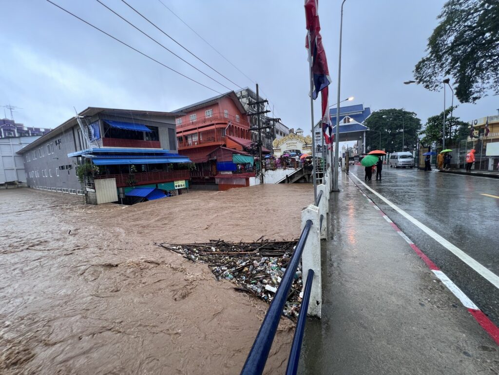ประชาสัมพันธ์จังหวัดเชียงราย รายงานสถานการณ์อุทกภัยที่ชายแดนไทย-เมียนมา อ.แม่สาย โดยมีพื้นที่ที่ได้รับผลกระทบหนักคือซอย 4 ซอย 6 ถนนเหมืองแดงซึ่งน้ำท่วมสูงท่วมศีรษะและยังไหลเชี่ยวกราก แต่เนื่องจากการเข้าไปถึงเป็นไปด้วยความยากลำบากทำให้ชาวบ้านยังติดอยู่ตามจุดต่างๆ ทางด้านนายสุทธิพงษ์ จุลเจริญ ปลัดกระทรวงมหาดไทย พล.อ.ทรงวิทย์ หนุนภักดี ผู้บัญชาการทหารสูงสุด นายพุฒิพงศ์ ศิริมาตย์ ผู้ว่าราชการจังหวัดเชียงราย และ พล.ต.บุญญทธิ์ เกษตรเวทิน ผู้บัญชาการมณฑลทหารบกที่ 37