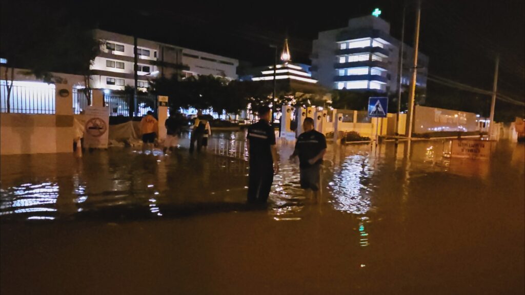 โรงพยาบาลสุโขทัยเตรียมแผนรับน้ำท่วม หลังระดับน้ำเอ่อเข้าท่วมขังผิวถนนด้านหน้า