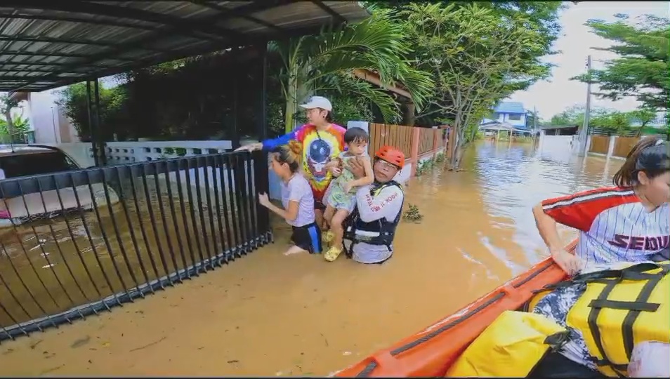 ซึ่งมีครอบครัวหนึ่ง เป็นคุณแม่กับลูกเล็กๆ อีก 2 คนรอความช่วยเหลืออยู่ในบ้าน ซึ่งน้ำทะลักเข้าในตัวบ้านชั้น 1 แล้ว ต้องนำข้าวของจำเป็นและลูก 2 คนนั่งรออยู่บนกระโปรงรถยนต์ จนกู้ภัยฯ มาถึง ก็อุ้มลูกกระเต.ใส่หลังพาเดินออกมาดด้วยสีหน้าที่ยิ้มแย้ม แม้ว่าจะต้องประสบภัย ซึ่งทีมกู้ภัยและทุกคนที่เห็นต่างรู้สึกประทับใจที่คุณแม่ยังมีกำลังใจที่ดีเยี่ยม ดูแลลูกๆได้เป็นอย่างดี