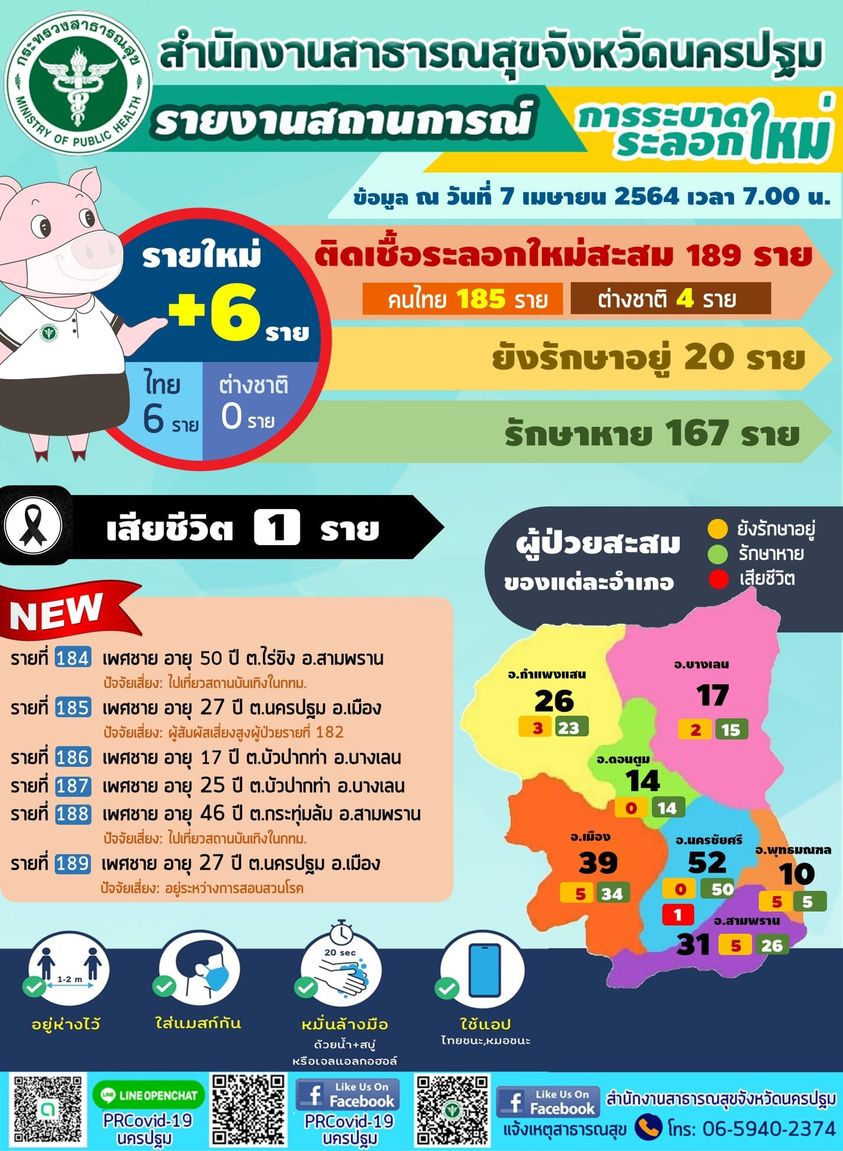 ผู้ป่วยระลอกใหม่รายที่ 184 ทำงานสถานบันเทิงใน กทม. เพศชาย อายุ 50 ปี ต.ไร่ขิง อ.สามพราน ผู้ป่วยระลอกใหม่รายที่ 185 ผู้สัมผัสเสี่ยงสูงรายที่ 182 เพศชาย อายุ 27 ปี ต.นครปฐม อ.เมือง ผู้ป่วยระลอกใหม่รายที่ 186 เข้าสถานบันเทิงใน กทม. เพศชาย อายุ 17 ปีต.บัวปากท่า อ.บางเลนผู้ป่วยระลอกใหม่รายที่ 187 เข้าสถานบันเทิงใน กทม. เพศชาย อายุ 25 ปี ต.บัวปากท่า อ.บางเลนผู้ป่วยระลอกใหม่รายที่ 188 ทำงานสถานบันเทิงใน กทม. เพศชาย อายุ 46 ปี ต.กระทุ่มล้ม อ.สามพรานผู้ป่วยระลอกใหม่รายที่ 189 อยู่ระหว่างสอบสวนโรค เพศชาย อายุ 27 ปี ต.นครปฐม อ.เมืองผู้สัมผัสเสี่ยงสูงทุกรายได้รับการดำเนินการตามมาตรการกระทรวงสาธารณสุขเรียบร้อยแล้ว