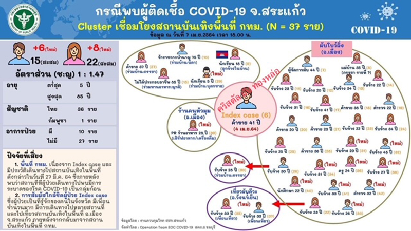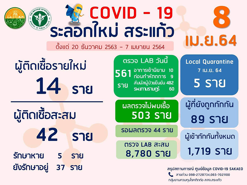 นายเกียรติศักดิ์ จันทรา ผู้ว่าราชการจังหวัดสระแก้ว เปิดเผยว่า วันนี้(8 เมษายน 64) พบผู้ป่วยโควิด-19 ยืนยันเพิ่มขึ้นอีก 14 ราย เป็นเพศหญิง 8 ราย อายุ 22-33 ปี และเพศชาย 6 ราย อายุ 5-45 ปี ทำให้ปัจจุบันจังหวัดสระแก้วมีผู้ป่วยสะสมจากการระบาดระลอกใหม่ (ตั้งแต่วันที่ 20 ธันวาคม 2563 ถึง 8 เมษายน 2564) จำนวน 42 ราย ถ้านับเฉพาะจำนวนผู้ติดเชื้อจากกรณีสถานบันเทิงใน กทม. ของผู้ป่วยรายที่ 6 ที่นำมาแพร่ทำให้จังหวัดสระแก้วมีผู้ป่วยโควิด-19 รวมทั้งสิ้น 37 ราย สำหรับผู้ป่วยที่รายงานใหม่วันนี้ 14 ราย ทั้งหมดติดเชื้อมาจากโบว์ลิ่งผับและผู้ใกล้ชิด ทั้งเพื่อนและญาติ มีภูมิลำเนาอยู่อำเภอเมืองสระแก้ว 10 คน อำเภอวัฒนานคร 1 คน อำเภอเขาฉกรรจ์ 1 คน กรุงเทพมหานคร 1 คน และจังหวัดยโสธร 1 คน ขณะนี้ได้เข้ารับการรักษาอยู่โรงพยาบาลสมเด็จพระยุพราชสระแก้ว จำนวน 27 ราย โรงพยาบาลเกษมราษฎร์ อำเภออรัญประเทศ จำนวน 6 ราย และโรงพยาบาลสนาม (โรงพยาบาลแพทย์แผนไทยวัฒนานคร) จำนวน 4 ราย ส่วนใหญ่ไม่มีอาการและผู้ป่วยบางคนมีอาการเล็กน้อย จำนวน 10 ราย