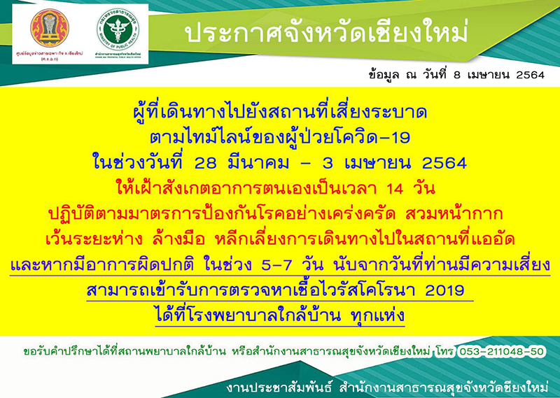 นายวีระพันธ์ ดีอ่อน รองผู้ว่าราชการจังหวัดเชียงใหม่ แถลงข่าวถึงสถานการณ์โรคโควิด -19 ในพื้นที่จังหวัดเชียงใหม่ ประจำวันที่ 8 เม.ย. 64 ซึ่งยังคงพบผู้ติดเชื้อไวรัสโคโรนา หรือ โควิด-19 เพิ่มอย่างต่อเนื่อง โดยในวันนี้พบเพิ่มอีก 36 รายซึ่งเกี่ยวพันกับสถานบริการ สถานประกอบการฯ คณะกรรมการโรคติดต่อจังหวัดเชียงใหม่จึงมีมติให้สถานบริการ สถานประกอบการคล้ายสถานบริการ ผับ บาร์ คาราโอเกะ เป็นเวลา 7 วัน นับตั้งแต่วันที่ 9 เม.ย. 64 เป็นต้นไป โดยทุกร้านที่เปิดให้บริการในวันนี้(8 เม.ย.) ต้องบันทึกรายชื่อลูกค้าที่เข้าใช้บริการทั้งหมดและส่งให้คณะกรรมการโรคติดต่อจังหวัดเชียงใหม่ นอกจากนี้ยังมีมติห้ามการบริโภคเครื่องดื่มแอลกอฮอล์ในร้านอาหารทุกประเภทเป็นเวลา 7 วัน นับแต่วันที่ 9 เม.ย. 64 เป็นต้นไปด้วย สำหรับการจัดกิจกรรมต่างๆ คณะกรรมการโรคติดต่อจังหวัดเชียงใหม่มีมติใหม่ โดยกำหนดให้การจัดกิจกรรมได้ผู้ร่วมกิจกรรมต้องไม่เกิน 200 คน หากคนร่วมกิจกรรมเกินกว่า 200 คน ไม่ควรจัด หากมีความจำเป็นอย่างยิ่งต้องเสนอรูปแบบการจัดกิจกรรมให้คณะกรรมโรคติดต่อจังหวัดเชียงใหม่พิจารณา