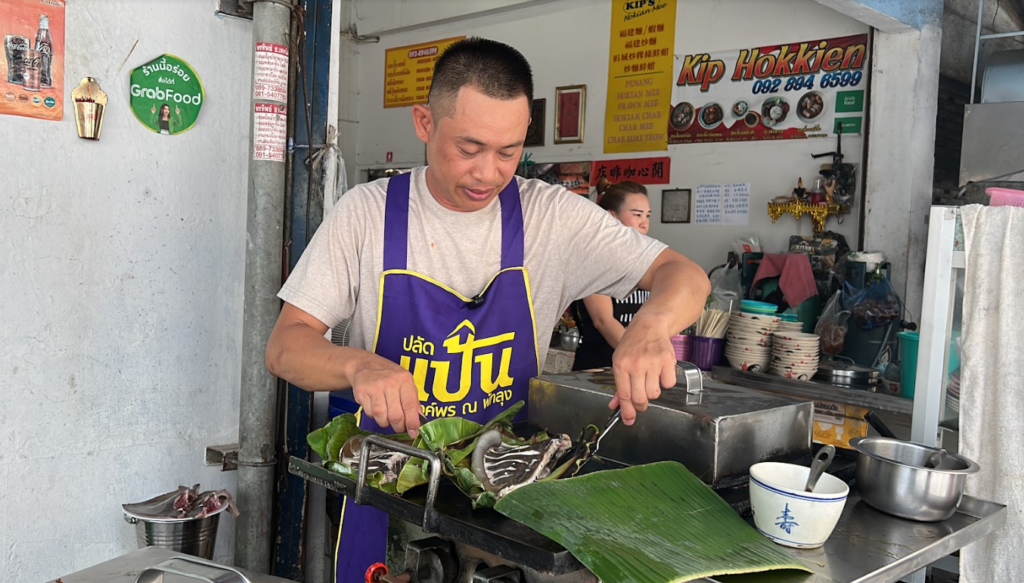 แต่ก่อนเป็นผู้รับเหมาก่อสร้าง และไปได้สูตรปลากระเบนย่างมา ก็เลยมาทำขายกับพี่สาว ซึ่งเปิดร้านขายหมี่ฮกเกี้ยนอยู่ก่อนแล้วสำหรับปลากระเบนย่างเครื่องแกงสูตรปีนังขายมา 10กว่าปีแล้ว ปลากระเบนสั่งมาจากจ.สตูล ส่วนเครื่องปรุงเป็สูตรเฉพาะของร้านเป็นสูตรมาจากมาเลเซีย แต่เอามาปรับเอามาแต่งเติมให้เข้ากับรสชาติอาหารไทยให้คนไทยกินได้ ราคาเริ่มต้นตั้งแต่ตัวละ 150 บาท ถึง 200 บาท แล้วแต่ขนาดปลาที่ทำ
