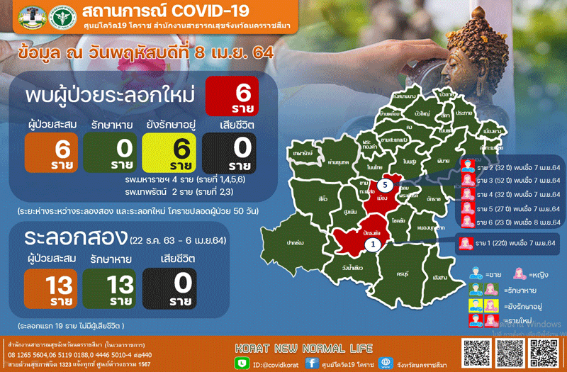 จังหวัดนครราชสีมา ได้เปิดเผยสถานการณ์การแพร่ระบาดของไวรัสโควิด-19 ในพื้นที่ โคราช ล่าสุด ว่า พบผู้ป่วยรายใหม่อีก 6 ราย ประกอบด้วย ชายอายุ 32 ปี หญิงอายุ 52 ปีหญิงอายุ 32 ปี หญิงอายุ 27 ปี และหญิงอายุ 23 ปี