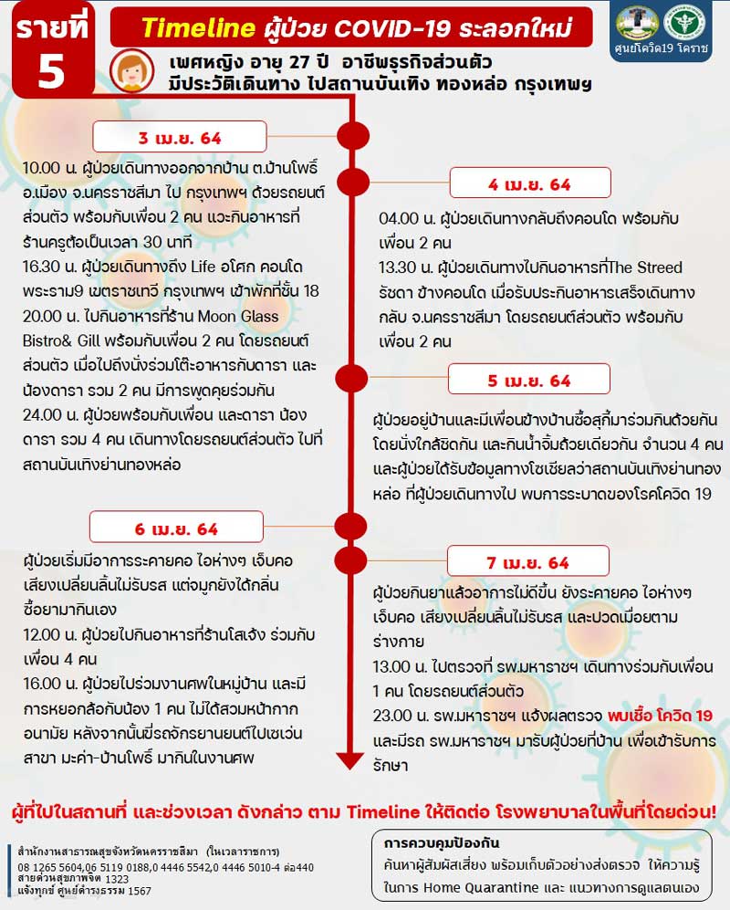 โดยผู้ป่วย 5 รายแรก อยู่ในพื้นที่อำเภอเมืองนครราชสีมา ส่วนผู้ป่วยรายที่ 6 เป็นหญิงอายุ 22 ปี อยู่ในพื้นที่อำเภอปักธงชัย ซึ่งผู้ป่วยส่วนใหญ่มีไทม์ไลน์เกี่ยวข้องกับคลัสเตอร์สถานบันเทิงในพื้นที่กรุงเทพมหานคร