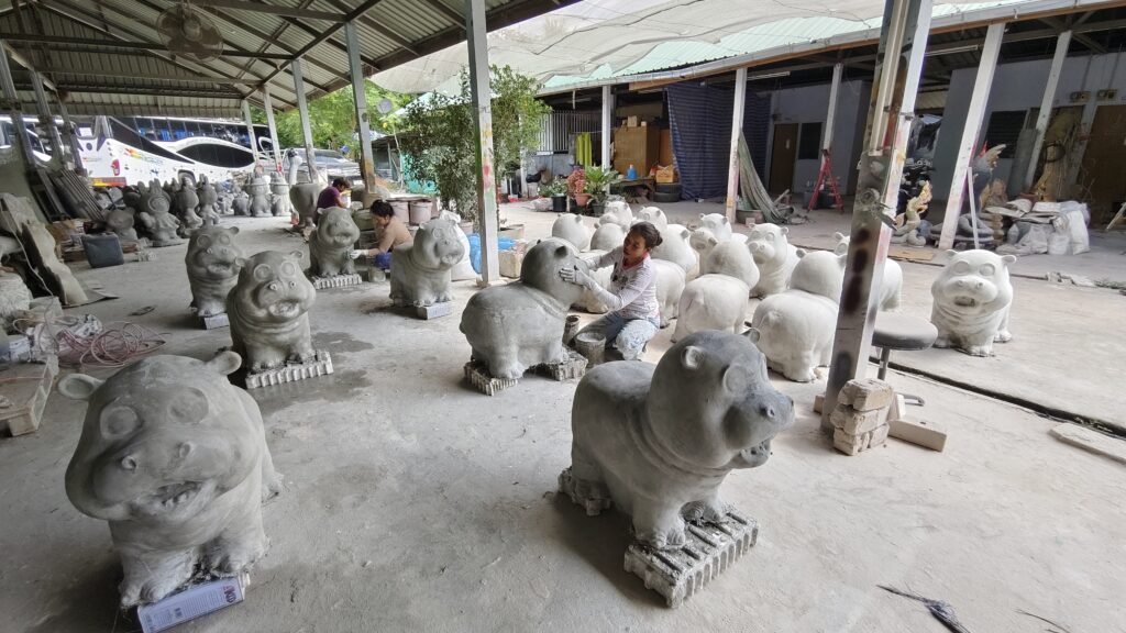 อย่างเช่นที่ร้านพระคุณหินทราย ของคุณนิสรารัตน์ ภูคลัง อายุ 34 ปี ซึ่งตอนนี้กำลังเร่งปั้นรูปปั้นฮิโปน้องหมูเด้ง หลากหลายขนาด เพื่อส่งจำหน่ายให้กับลูกค้าที่มาออเดอร์ และกำลังขึ้นรูเต็มร้านไว้หลายสิบตัว แต่กลับเหลือรูปปั้นที่ทำเสร็จละลงสีตั้งเอาไว้เพื่อให้ลูกค้าไดดูแบบเบื้องต้นหน้าร้านเพียงแค่ตัวเดียวเท่านั้น