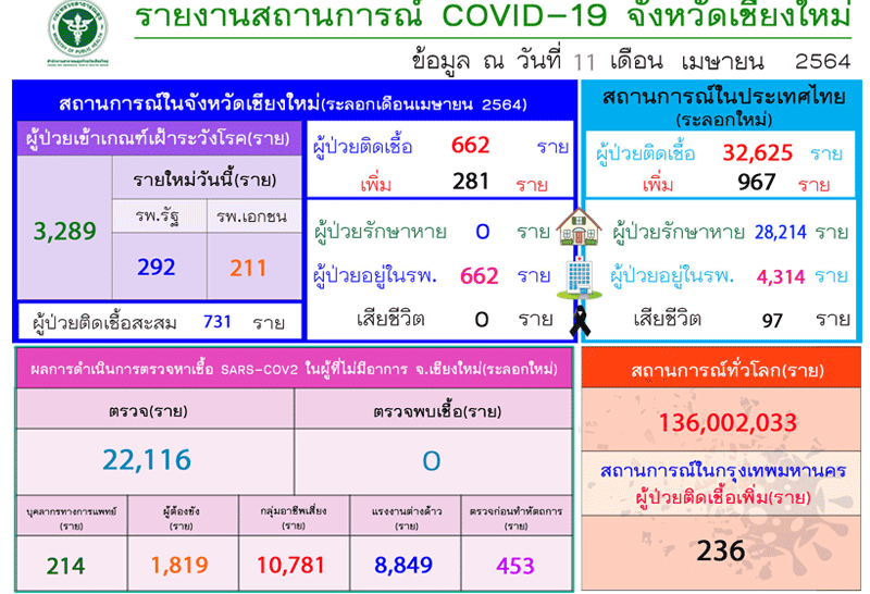 ผู้สื่อข่าวรายงานว่า เพจสำนักงานประชาสัมพันธ์จังหวัดเชียงใหม่โพตส์ว่า วันนี้ 11 เมษายน 2564 พบผู้ติดเชื้อโควิด-19 เพิ่ม 281 ราย ทำให้ ยอดผู้ป่วยสะสมระลอกใหม่ รวมเป็น 662 รายแล้ว รักษาตัวอยู่ที่โรงพยาบาลรัฐฯ จำนวน 292 ราย รักษาโรงพยาบาลเอกชน 211 ราย ซึ่งยังไม่พบผู้เสียชีวิตในจังหวัดแต่อย่างใด สำหรับผู้ที่ไม่แสดงอาการแบ่งเป็น บุคลากรทางแพทย์ 214 ราย ผู้ต้องขัง 1,819 ราย กลุ่มอาชีพเสี่ยง 10,781 ราย แรงงานต่างด้าว 8,849 ราย และตรวจก่อนทำหัตถการอีก 453 ราย ขณะที่ทั่วโลกมีผู้ติดเชื้อกว่า 136,002,033 ราย