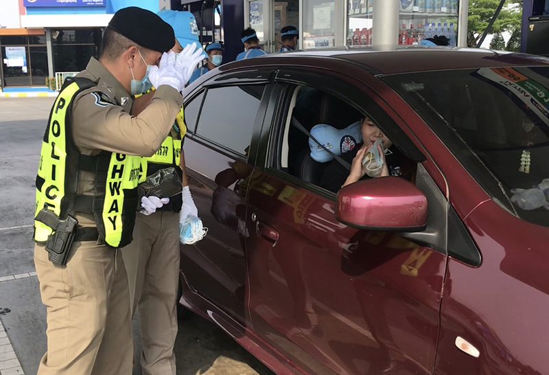 ขณะเดียวกัน ที่บริเวณปั๊ม ปตท.ริมถนนทางหลวงหมายเลข 207 (ถนนเจนจบทิศ) ต.ทุ่งสว่าง อ.ประทาย จ.นครราชสีมา ได้มีเจ้าหน้าที่ตำรวจทางหลวง จากหน่วยบริการประชาชนตำรวจทางหลวงประทาย เดินประชาสัมพันธ์การป้องกันการแพร่ระบาดของไวรัสโควิด-19 พร้อมกับแจกหน้ากากอนามัย และน้ำดื่มให้กับประชาชนที่เดินทางกลับภูมิลำเนาภาคอีสาน ช่วงเทศกาลสงกรานต์ หลังจากที่พบว่าช่วงนี้สถานการณ์การแพร่ระบาดของไวรัสโควิด-19 ในหลายพื้นที่ของภาคอีสาน กำลังแพร่ระบาดอย่างรวดเร็ว