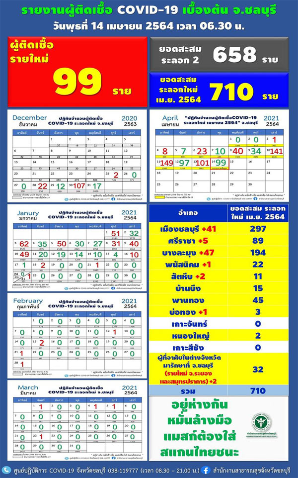 สำนักงานประชาสัมพันธ์จังหวัดชลบุรี รายงานสถานการณ์ผู้ติดเชื้อโควิด-19 ข้อมูล ณ วันที่ 14 เมษายน 2564 เวลา 06.30 น.พบผู้ติดเชื้อโควิด-19 รายใหม่ จำนวน 99 รายส่งผลให้มีผู้ป่วยระลอกใหม่สะสมแล้ว 710 ราย ประกอบด้วย ผู้ติดเชื้อโควิด-19 cluster Flintstone 5 ราย (ตั้งแต่วันที่ 6 เมษายน 2564 เป็นจำนวนทั้งสิ้น 137 ราย), ผู้ติดเชื้อโควิด-19 จากสถานบันเทิงอื่นๆ รายละเอียดดังนี้ Cetus พัทยา จำนวน 3 ราย, Bone พัทยา จำนวน 1 ราย, The Box 69 พัทยา จำนวน 3 ราย, Garden 168 จำนวน 3 ราย , Insomnia พัทยา จำนวน 1 คน, Infinity ศรีราชา จำนวน 4 ราย, Replay บางแสน จำนวน 3 ราย, สถานบันเทิงใน กทม. จำนวน 4 ราย, ผู้สัมผัสและบุคคลในครอบครัวผู้ป่วยติดเชื้อโควิด-19 จำนวน 29 ราย, จากต่างจังหวัดเข้ามารักษาชลบุรี 2 ราย คือ สมุทรปราการ จำนวน 1 รายและระยอง จำนวน 1 ราย, อยู่ระหว่างสอบสวนโรค จำนวน 41 ราย วันนี้มีการค้นหาผู้สัมผัสทั้งหมดจำนวน 342 ราย และค้นหาเชิงรุกอีกจำนวน 984 ราย (อยู่ระหว่างการรอผลตรวจ)