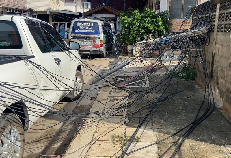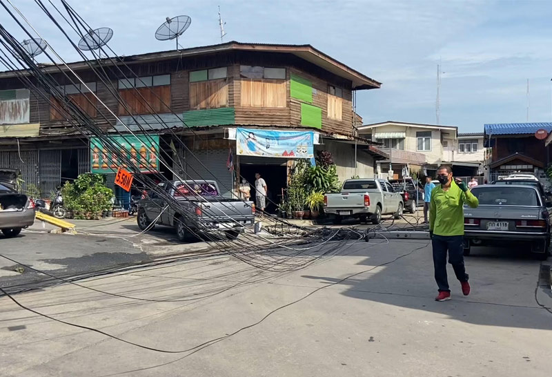รถ 6 ล้อส่งของเกี่ยวสายสื่อสารเสาไฟฟ้าหักโค่นล้มระเนระนาด โชคดีไม่มีบาดเจ็บ-เสียชีวิต เจ้าหน้าที่ตัดไฟทั่วเมือง