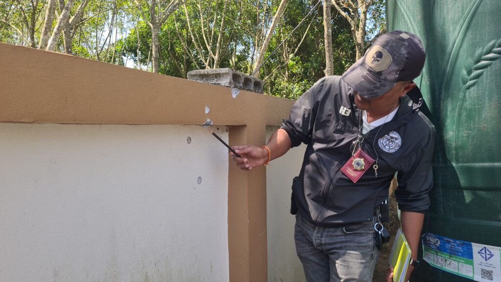 เพื่อนได้ช่วยกันพาตัวส่งโรงพยาบาลสงขลาไปก่อนแล้ว โดยพบกองเลือดอยู่บริเวณด้านหลังพูลวิลล่าตรวจที่เกิดเหตุพบลูกปลาย 3ลูกริมกำแพง จึงเก็บไว้เป็นหลักฐานและยังพบร่องรอยกระสุนปืนที่ริมกำแพงอีก 5 รูด้วนอกจากนี้ภายในพูลวิลล่ายังพบร่องรอยของการตั้งวงดื่มกินและมั่วสุมเสพยาเสพติดกันบนโต๊ะ พร้อมกับซองยาเค และมีดพร้าเหล็กอีก1 ด้าม