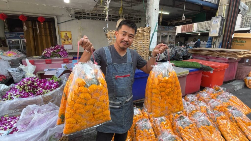 นายบัญญัติ อภิรักษากร อายุ 42 ปี เจ้าของร้านเจ๊รุ่งดอกไม้สด กว่าวว่า ราคาดอกไม้ไหว้พระปีนี้ราคาค่อนข้างตกต่ำเพราะว่าเป็นช่วงที่ว่างเว้นจากการทำนาเกษตรกรจึงหันมาปลูกดอกดาวเรืองกันเยอะขึ้น ทำให้ผลผลิตออกเยอะจึงทำให้ราคาตกต่ำลงเยอะเป็นแบบนี้เหมือนกันทั่วประเทศ ทำให้ขณะนี้ราคาดอกดาวเรืองขนาดใหญ่ราคาส่งอยู่ที่ 70-80 สตางค์ ถือว่าลดลงกว่าครึ่ง ซึ่งจากกรสอบถามทราบว่าคนปลูกเยอะพอผลผลิตออกมาทำให้ดอกดาวเรืองล้นตลาดบางทีก็ไม่มีตลาดรองรับจึงทำให้ราคาร่วงลงอย่างมาก