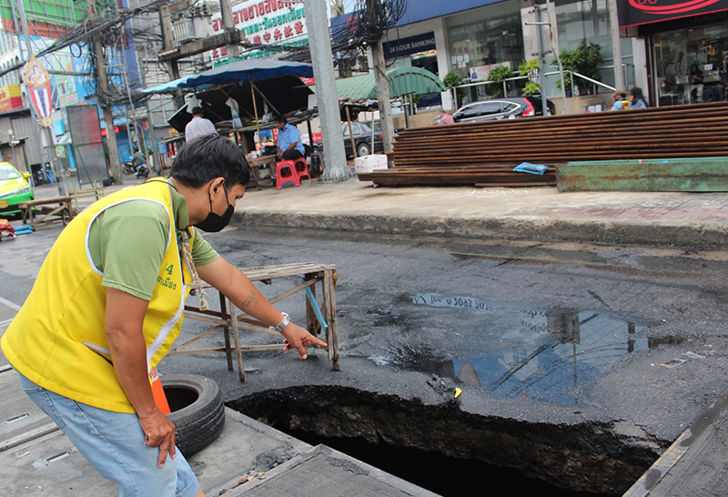 ผู้สื่อข่าวได้เดินทางไปยังที่เกิดเหตุพบถนนดังกล่าวเกิดการทรุดตัวและมีหลุมขนาดใหญ่ความลึกประมาณเกือบ 2 เมตร 2 จุด จากการเปิดเผยของนาย บัญญัติ แสนบุตร อายุ 63 ปี อาชีพขับวินจักรยานยนต์รับจ้าง ได้กล่าวว่า หลุมนี้เกิดขึ้นตอนฝนตนเมื่อช่วงเย็นที่ผ่านมา เพราะเมื่อวานก็ยังไม่เป็นอะไร ก็อยากจะฝากให้ ผู้ที่รับผิดชอบทำตรงนี้ทำให้ดีๆ เพื่อความปลอดภัยของประชาชนที่ขับรถผ่านไปผ่านมา แต่ก็โชคดีเหตุที่เกิดช่วงกลางวัน หากเป็นกลางคืนก็จะมีโอกาสเกิดอุบัติเหตุได้ เพราะในระหว่างที่ดินทรุดตัวนั้นตัวเองได้วิ่งมาเอากรวยมากั้น เพื่อป้องกันการเกิดอุบัติเหตุ