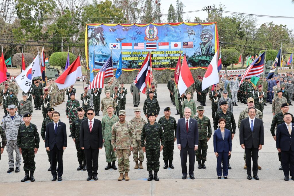 พล.อ.ทรงวิทย์ หนุนภักดี ผู้บัญชาการทหารสูงสุดของไทย พร้อมด้วยนายโรเบิร์ต เอฟ. โกเดค เอกอัครราชทูตสหรัฐฯ ประจำประเทศไทย และ GEN Ronald Clark ผู้บัญชาการกองกำลังทางบกสหรัฐฯ ภาคพื้นแปซิฟิก ได้ร่วมเป็นประธานเปิดการฝึกร่วม/ผสมทางทหาร “คอบร้าโกลด์ 2025” ที่สนามร่วมเริงไชย ภายในค่ายสุรนารี อ.เมือง จ.นครราชสีมา โดยมี เอกอัครราชทูตและเจ้าหน้าที่ระดับสูงจากประเทศที่เข้าร่วมฝึก เข้าร่วม