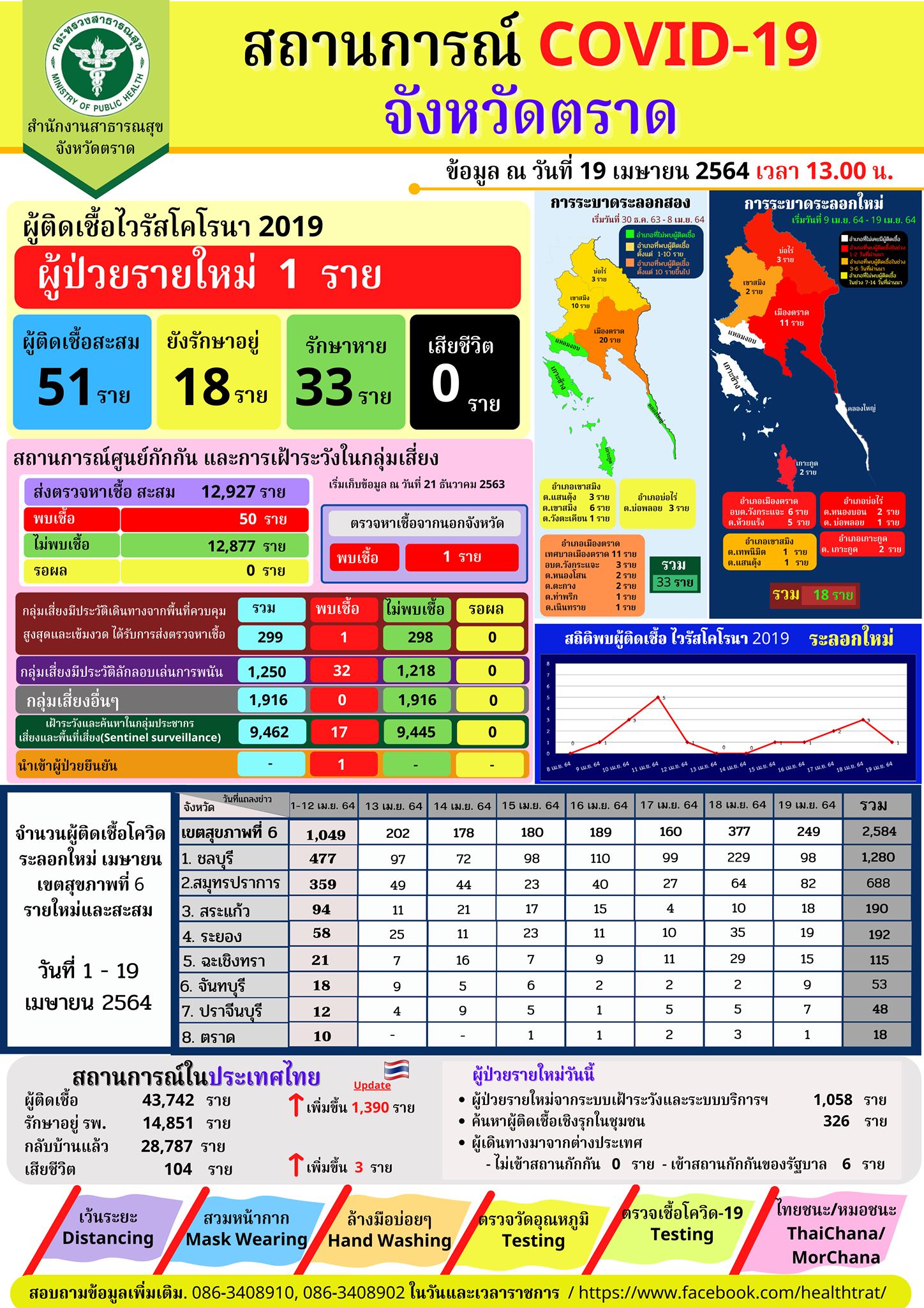 เพจ สำนักงานประชาสัมพันธ์จังหวัดตราด ระบุว่า นายแพทย์ภาณุวัฒน์ โสภณเลิศพงษ์ นายแพทย์เชี่ยวชาญด้านเวชกรรมป้องกัน สำนักงานสาธารณสุขจังหวัดตราด กล่าวระหว่างการประชุมคณะกรรมการโรคติดต่อจังหวัดตราด ว่า ปัจจุบันจังหวัดตราดมียอดรวมผู้ติดเชื้อจากโรคติดเชื้อไวรัสโคโรนา 2019 (COVID – 19) จากการระบาดระลอกใหม่เดือนเมษายน 2564 รวม 14 คน โดยหนึ่งในจำนวนนั้นเป็นพนักงานของรีสอร์ทในพื้นที่อำเภอเกาะกูด ดังนั้นเพื่อเป็นการค้นหาผู้ป่วยรายใหม่ในเชิงรุก ประกอบกับในช่วงวันหยุดยาวเทศกาลสงกรานต์ที่ผ่านมาพบว่ามีนักท่องเที่ยวจำนวนมากเดินทางมาจากพื้นที่ต่าง ๆ จำนวนมาก สำนักงานสาธารณสุขจังหวัดตราด โดยความร่วมมือจากสำนักงานสาธารณสุขอำเภอ และโรงพยาบาลทุกแห่ง จึงได้เตรียมออกสุ่มตรวจคัดกรองผู้ป่วยในเชิงรุก ในกลุ่มพนักงานสถานประกอบการ ร้านอาหาร ร้านค้าต่าง ๆ ในทุดพื้นที่ทั้ง 7 อำเภอของจังหวัดตราด ตั้งแต่สัปดาห์หน้าเป็นต้นไป โดยตั้งเป้าดำเนินการสุ่มตรวจไม่น้อยกว่า 900 คนต่อสัปดาห์ หรือไม่น้อยกว่า 1,800 คน