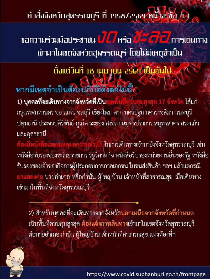 สุพรรณบุรี ประกาศขอความร่วมมือประชาชนงดหรือชะลอการเดินทางเข้ามาในพื้นที่ โดยไม่มีเหตุจำเป็น ตั้งแต่วันที่ 18 เมษายน 2564 เป็นต้นไปหากมีเหตุจำเป็นต้องปฏิบัติดังนี้