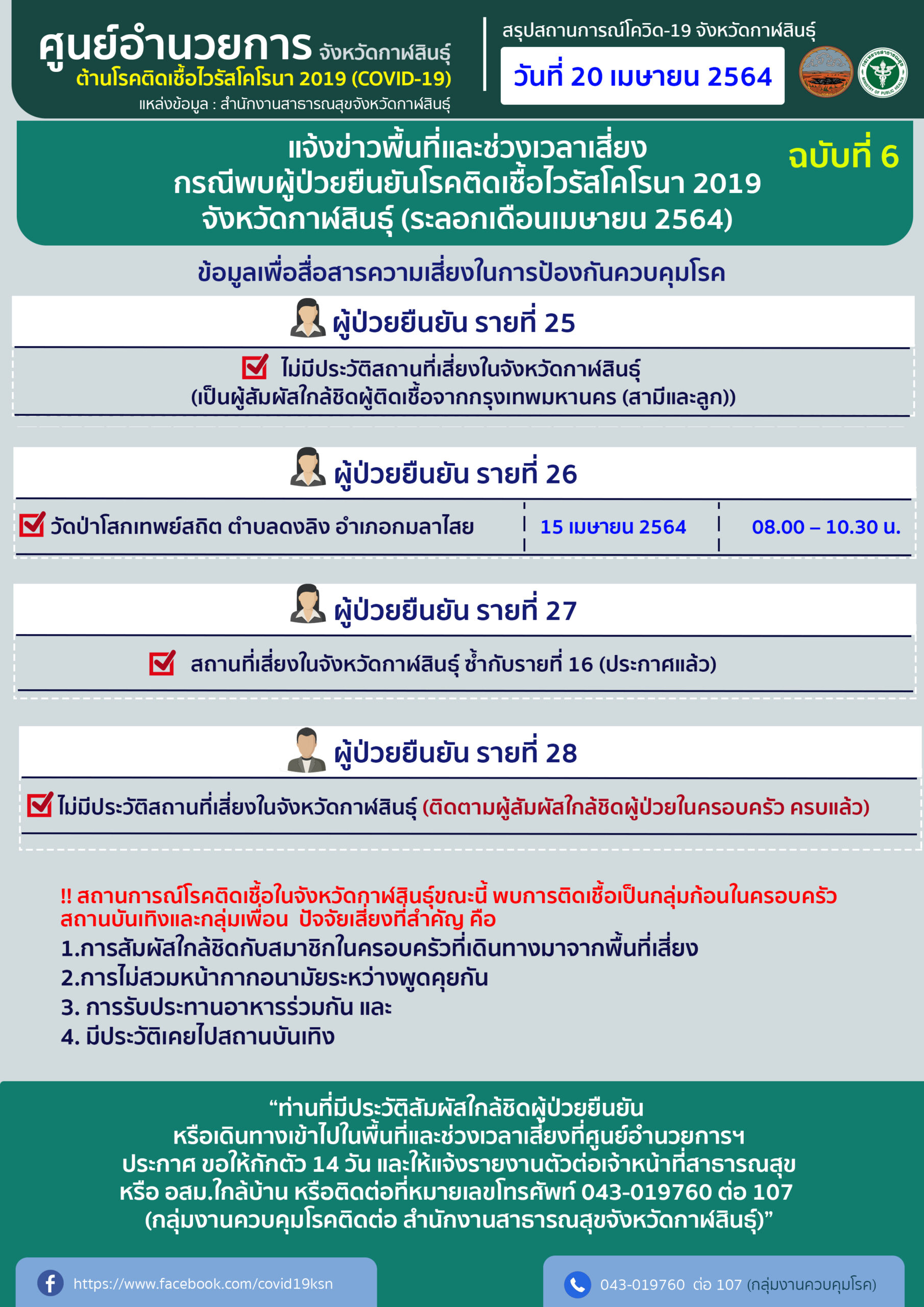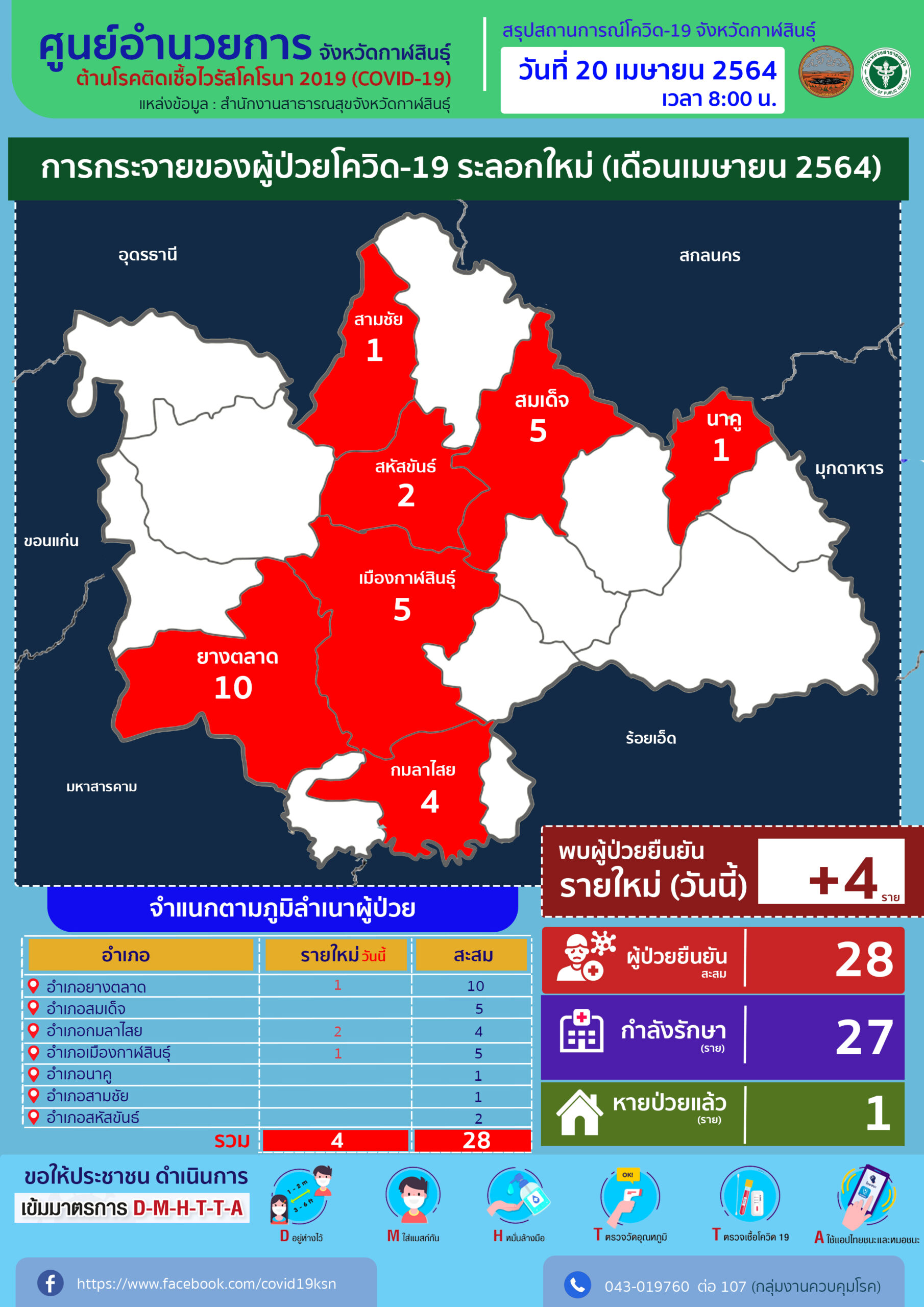 นายทรงพล ใจกริ่ม ผวจ.กาฬสินธุ์ กล่าวว่า สถานการณ์ป่วยโควิด-19 กาฬสินธุ์ วันนี้ มีผู้ป่วยรายใหม่เพิ่ม 4 ราย ผู้ป่วยเดิม 24 ราย รวมมีผู้ป่วยสะสม 28 ราย รักษาอยู่ในโรงพยาบาลกาฬสินธุ์ 19 ราย โรงพยาบาลฆ้องชัย 8 ราย หายป่วยแล้ว 1 ราย ผู้ป่วยเดิม รายที่ 1 – 24 ศูนย์อำนวยการฯ ได้แถลงไปแล้วเมื่อวันที่ 11 – 19 เมษายน 2564